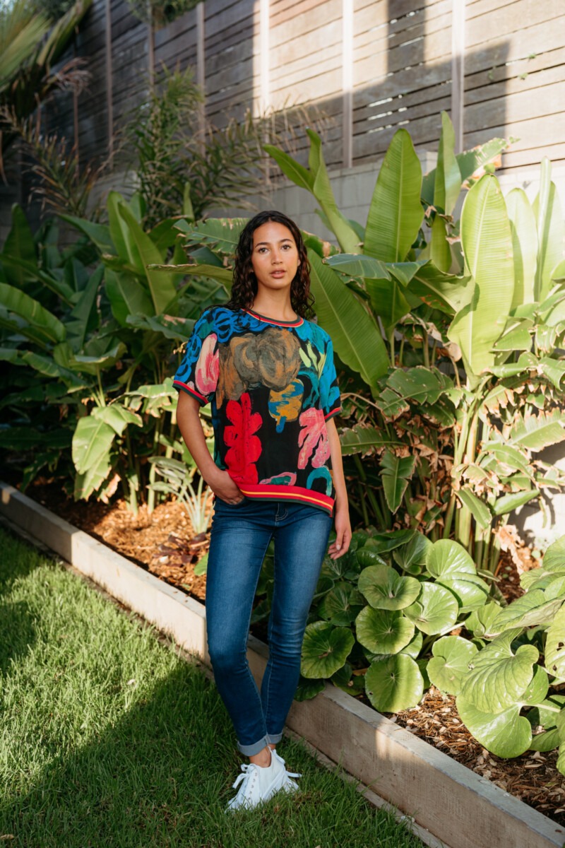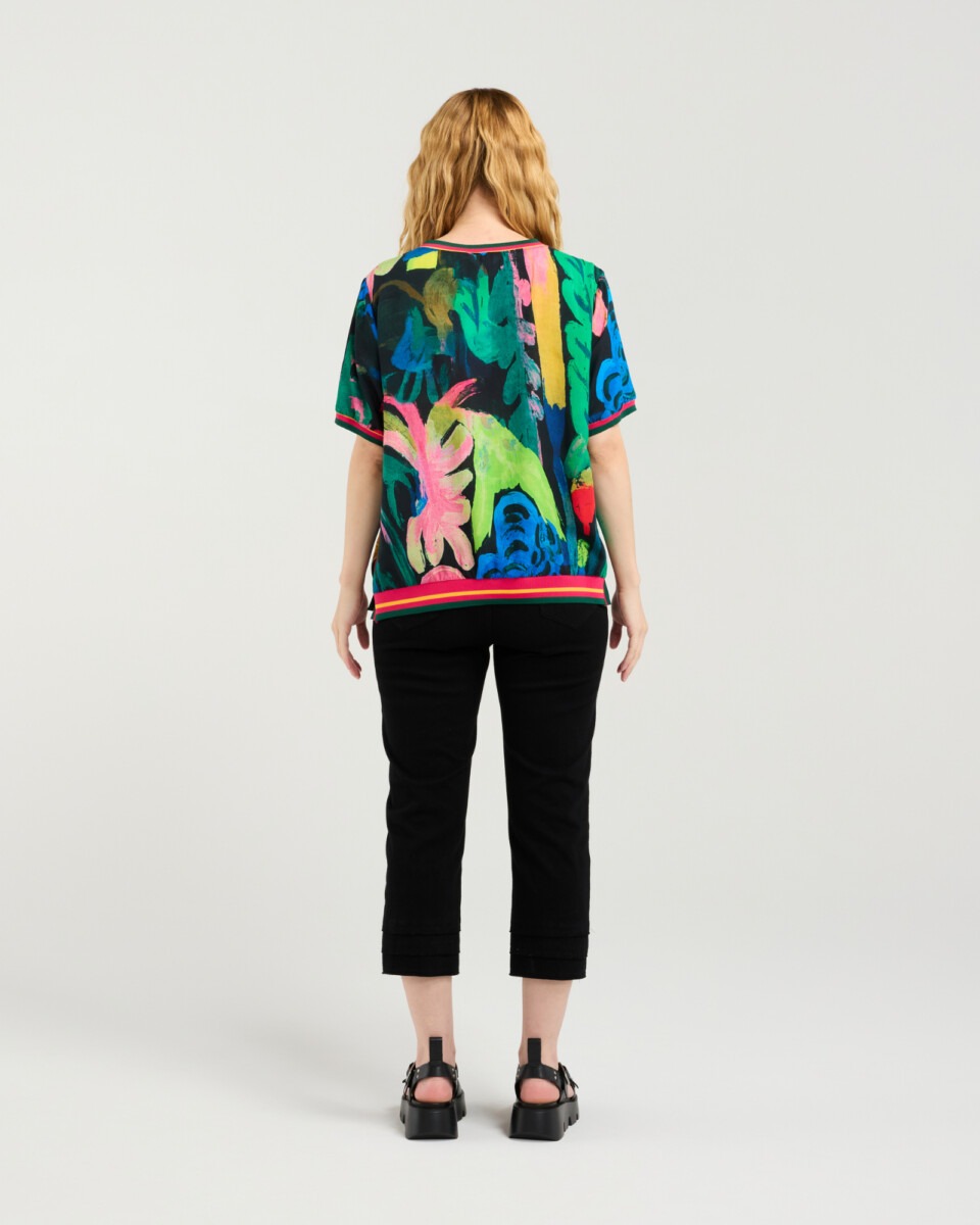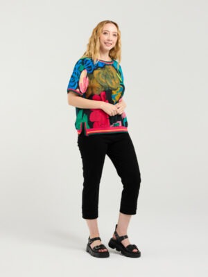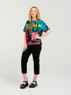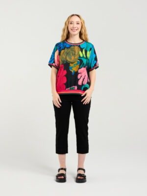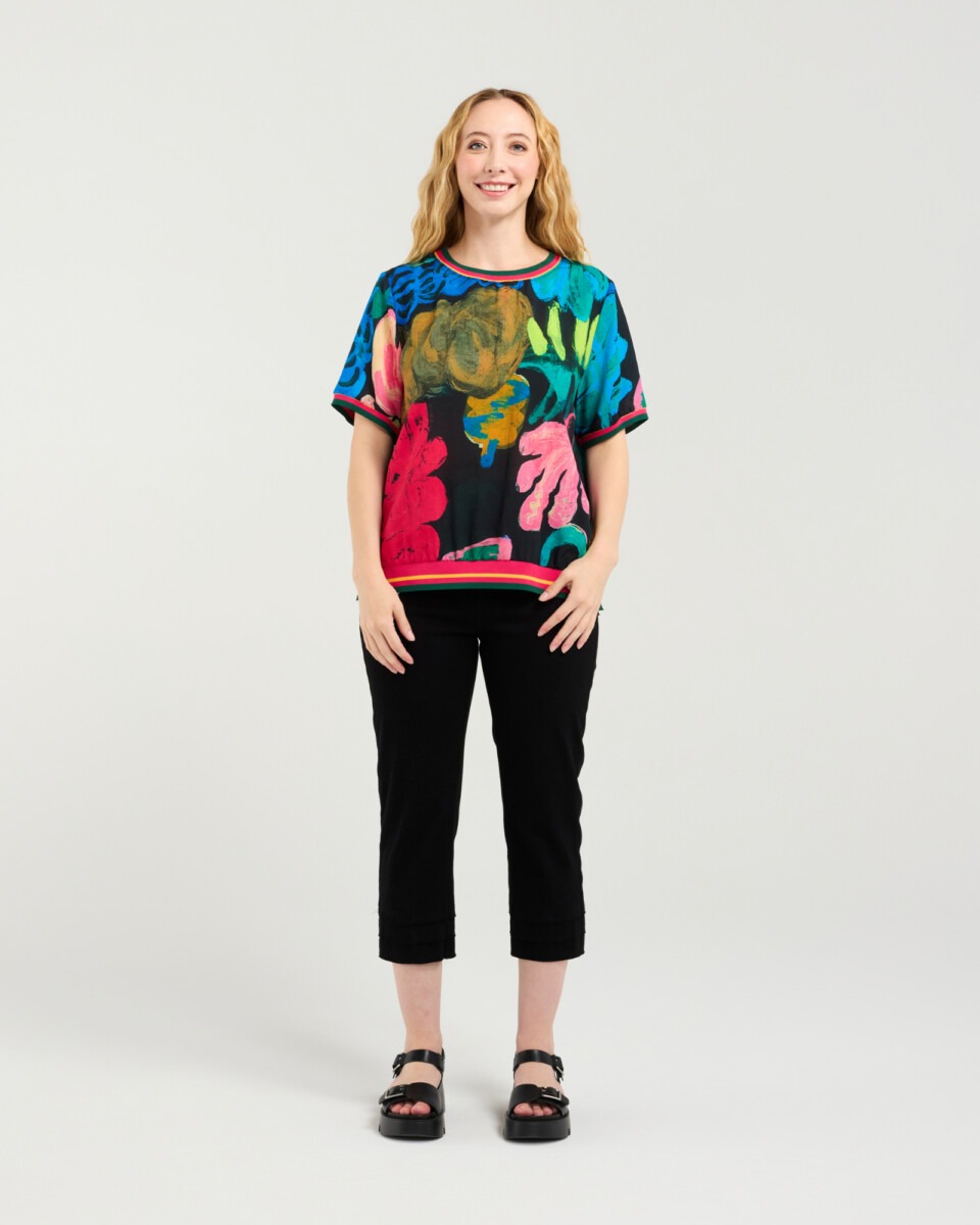 This effortlessly chic top maintains its relaxed silhouette and signature elastic trim detailing at the neckline, cuffs, and hemline, offering a flattering yet laid-back fit. The look is elevated with a black base print featuring abstract leaf motifs, bringing a modern, nature-inspired edge to the design.