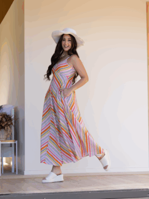 Knewe This full-length floaty summer Gala Dress features a colourful striped print and is made from a lightweight cotton-nylon blend. The dress is shaped through the bust and waist and flows into a relaxed, breezy skirt, perfect for warm days and effortless style.