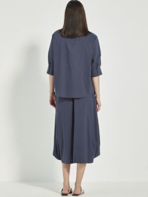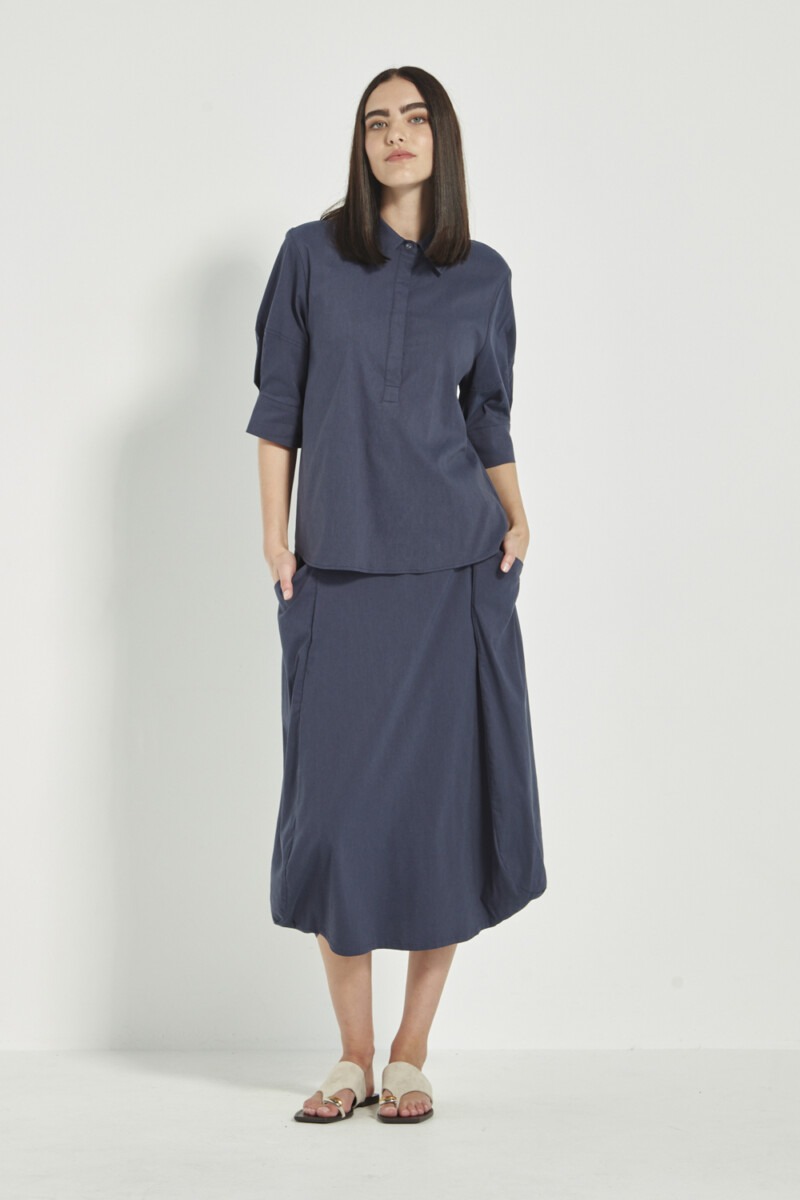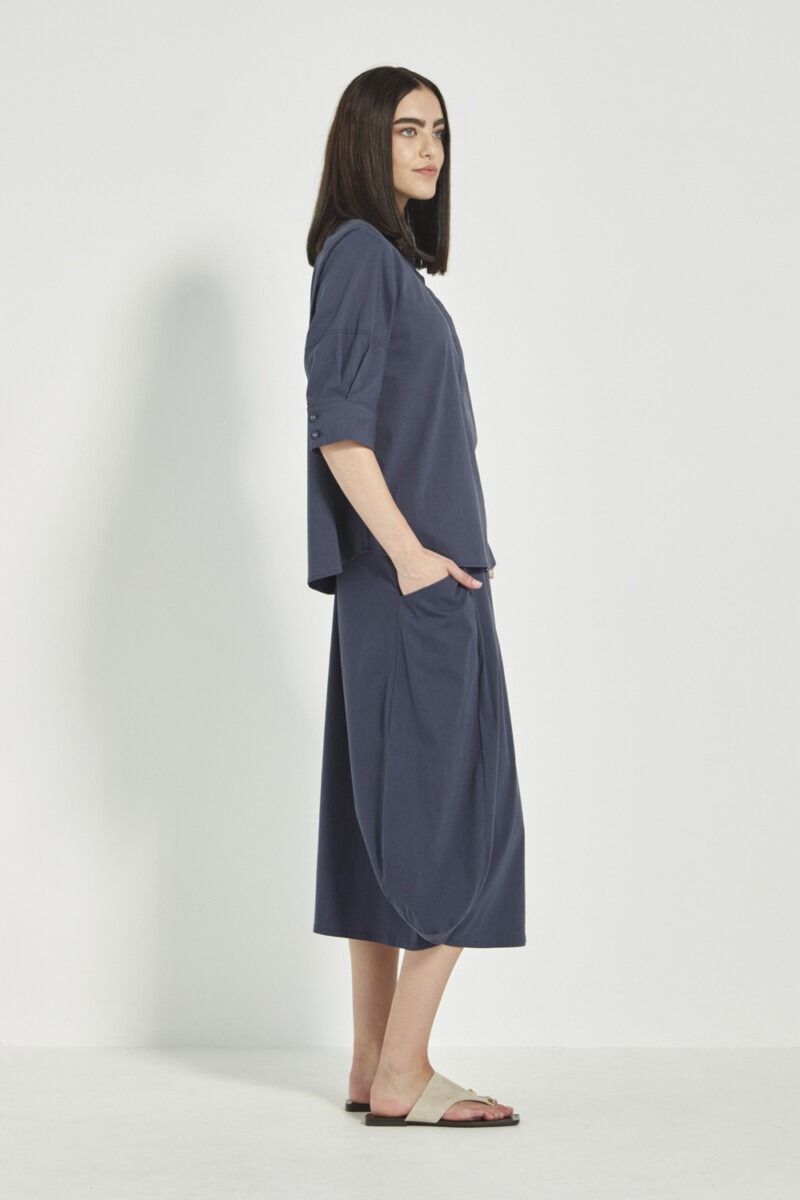 The Acrobat Emi Skirt features a soft basque waist for an easy, flattering fit. Flat through the front and back, with draped side panels flowing from the pockets to a below-the-knee hem, it offers a modern take on movement and silhouette.