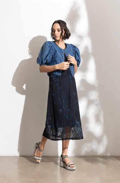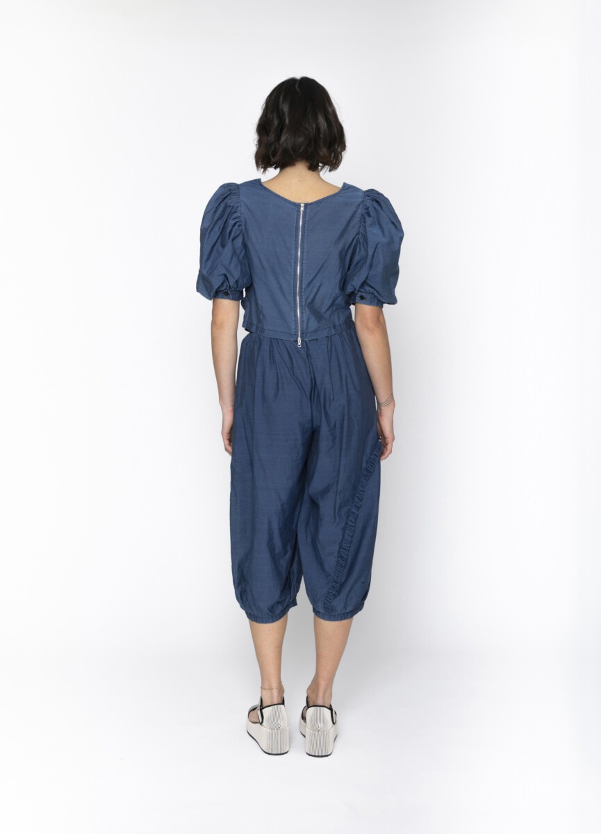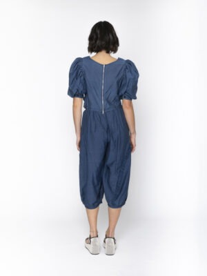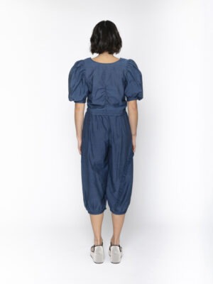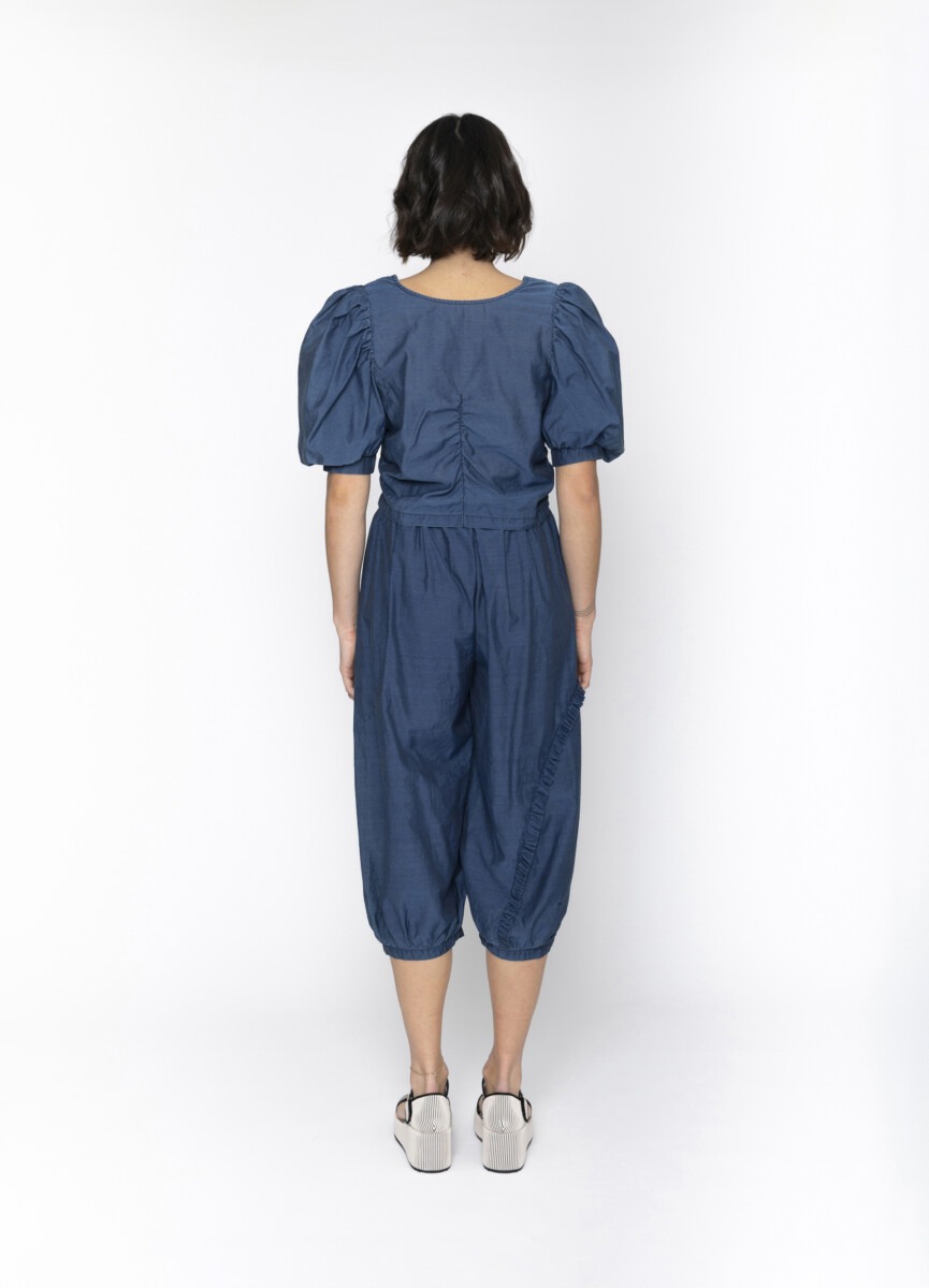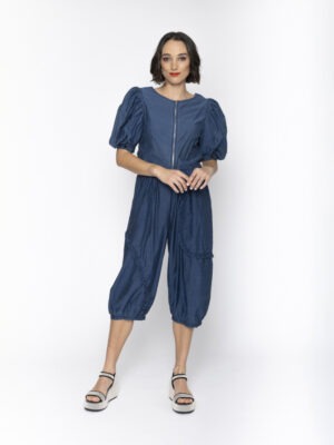 Reversible! Introducing the Annie Top in denim blue – a versatile and chic must-have for any fashionista. With its reversible design, zip closure, and feminine puff sleeves, this top is both fashionable and functional. The ruched center adds a touch of elegance to this must-have piece.