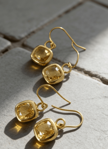 A beautiful glass earring with plated pendant in citrine colour. Silver square and hook.
