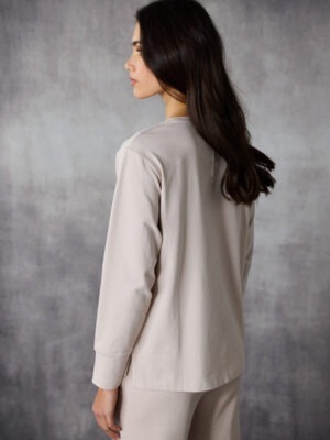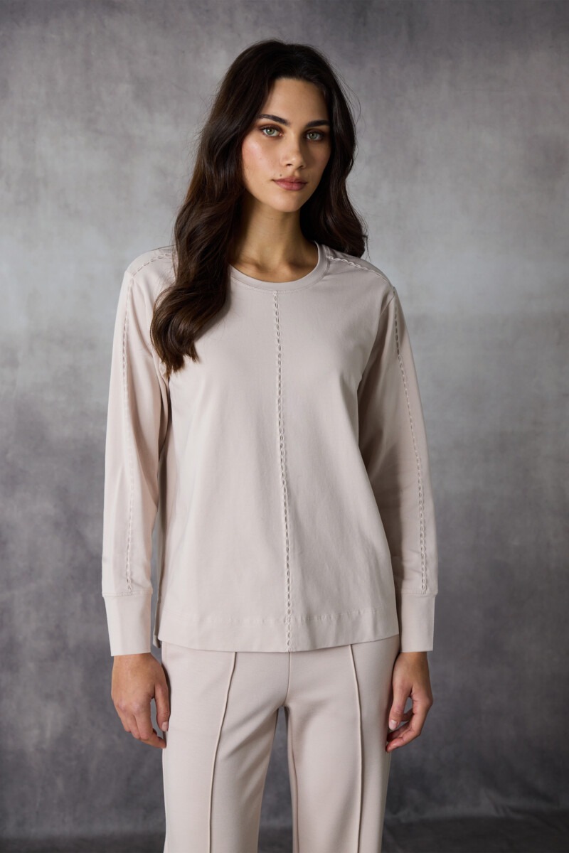 Crafted in a soft cotton blend, the Base top is a long sleeve staple with a subtle stitch detailing down the centre front, across the shoulder seam and down the sleeve. The stitch detail enchance it’s appeal, making it a verstile piece for layering with tonal colours or wearing on its own.