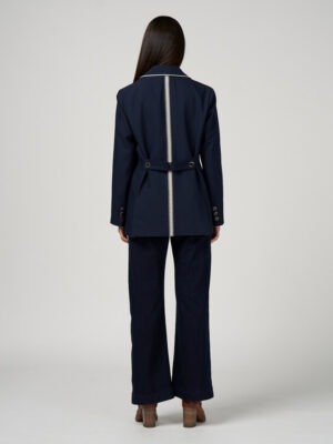 Stunning wool-blend longline blazer with a relaxed, manstyle silhouette, single breasted front and a sharp peaked collar. Finished with a contrast embroidered back waist tie that adjusts for shape, along with matching embroidery on the collar, and pocket flaps for a refined, tailored touch.
