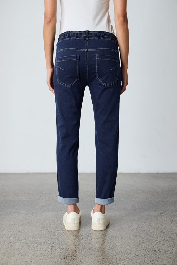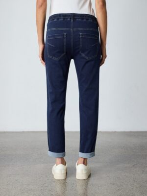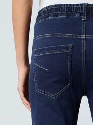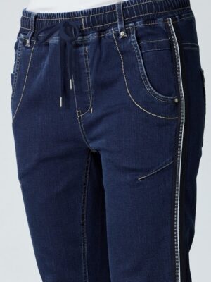 Casual jean with elasticated waist and adjustable drawstring tie. Novelty tape at the outside leg. Soft handle & distressed finish achieved by special garment wash.