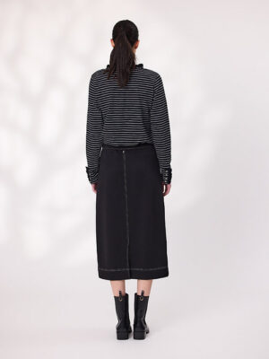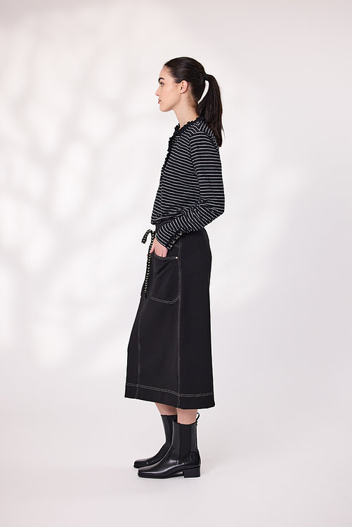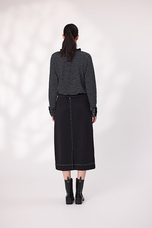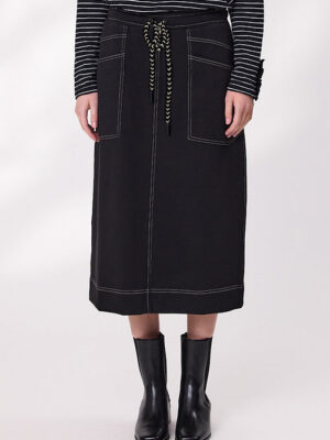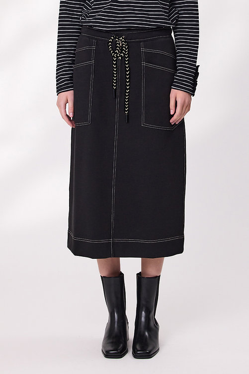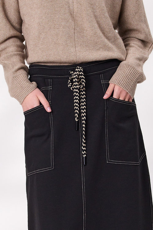 Comfort meets cool in this black knit skirt, designed with an elastic waistband and adjustable drawcord for a perfect fit. The contrast stitching adds a sporty edge, highlighting the seams and pocket details for a modern finish. Soft, stretchy, and easy to wear—this skirt is made for movement and style.