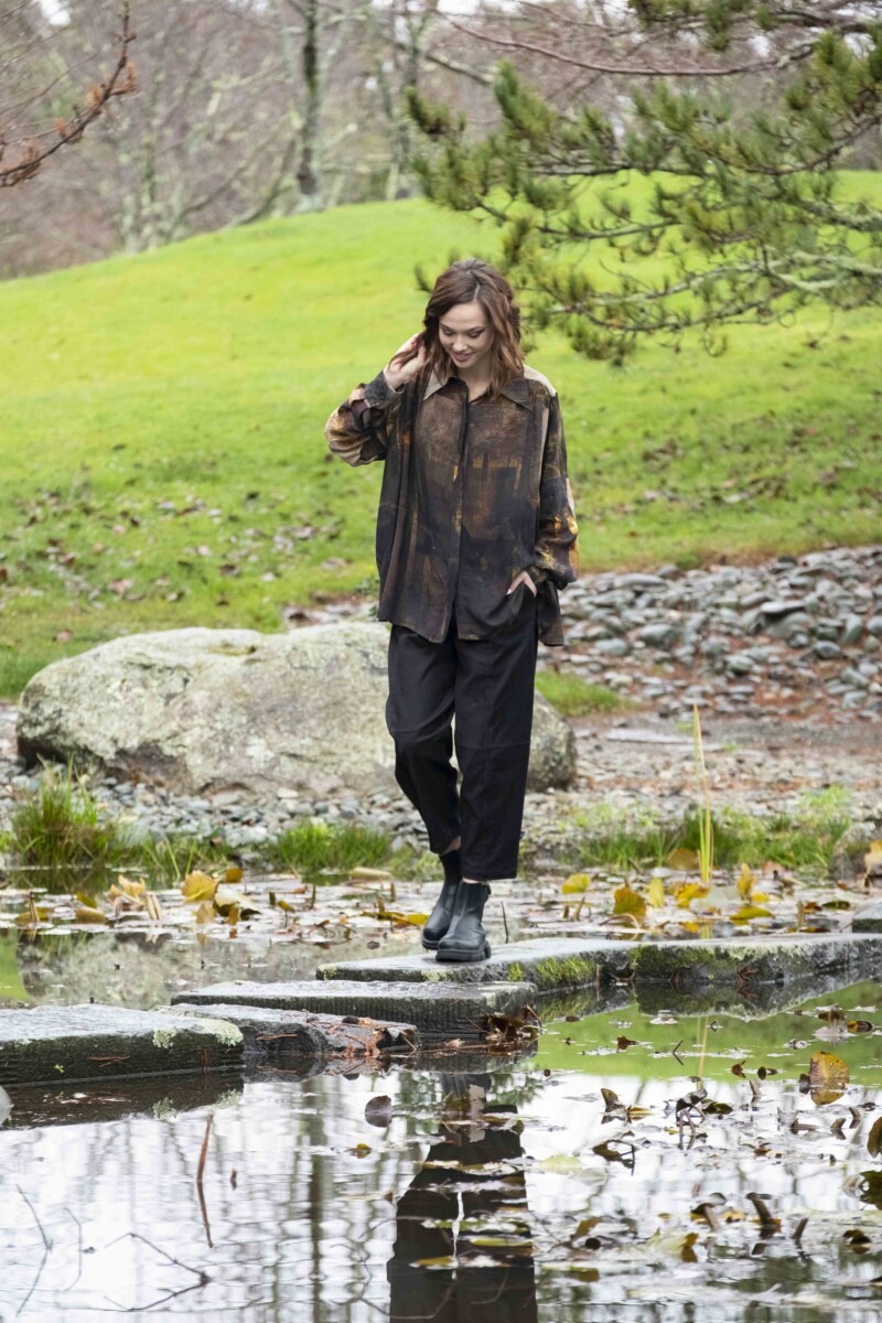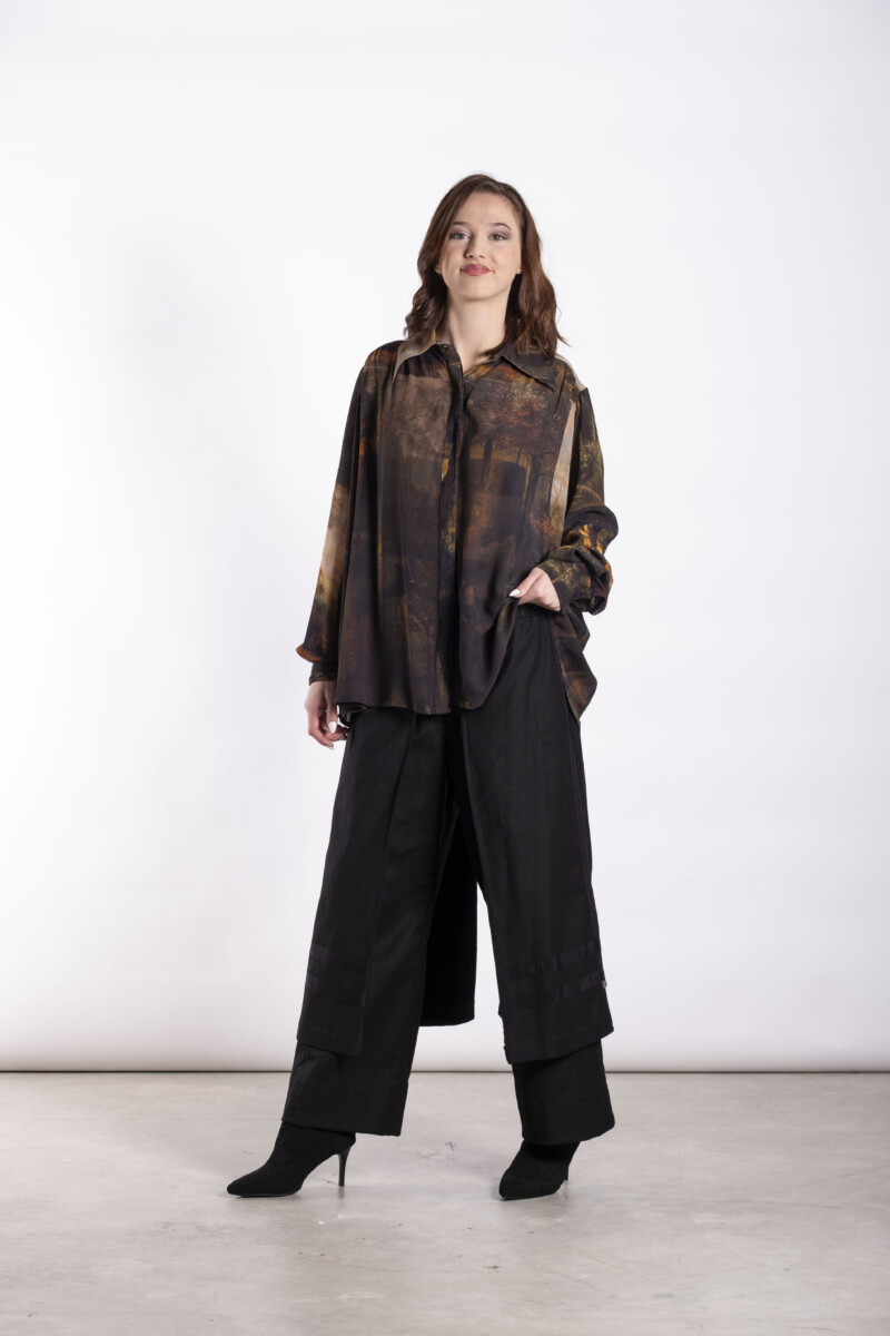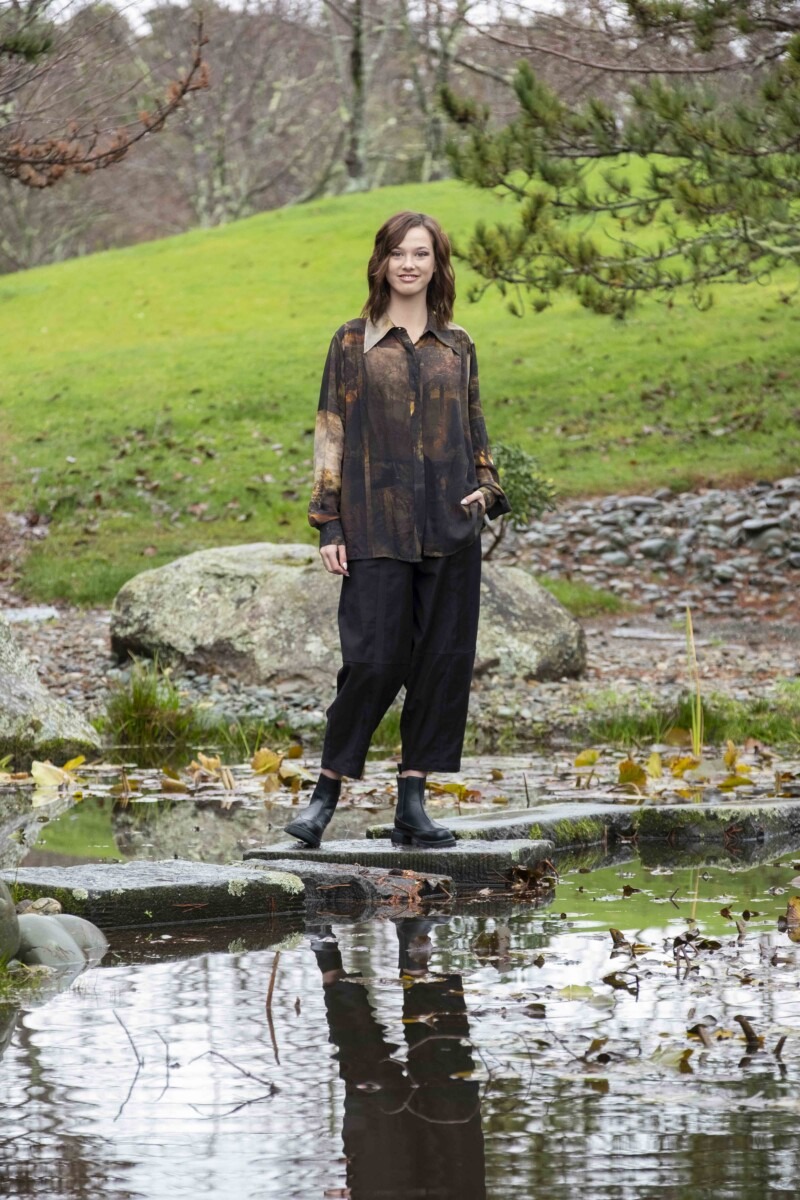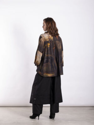 This is a softly structured women’s shirt designed with a relaxed, wearable silhouette and thoughtful tailoring details. Featuring a concealed button-through front and gentle shaping through the back yoke, the Buccaneer Shirt offers comfort and ease while maintaining a clean, refined look. The Midnight Trek print adds depth and storytelling, with subtle horses emerging through the lower body of the print, like shadows moving through the landscape.