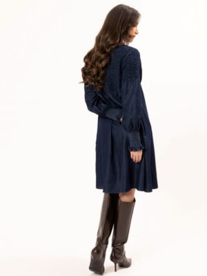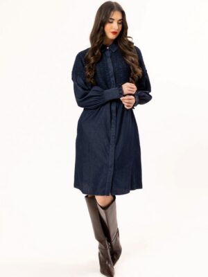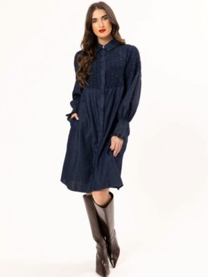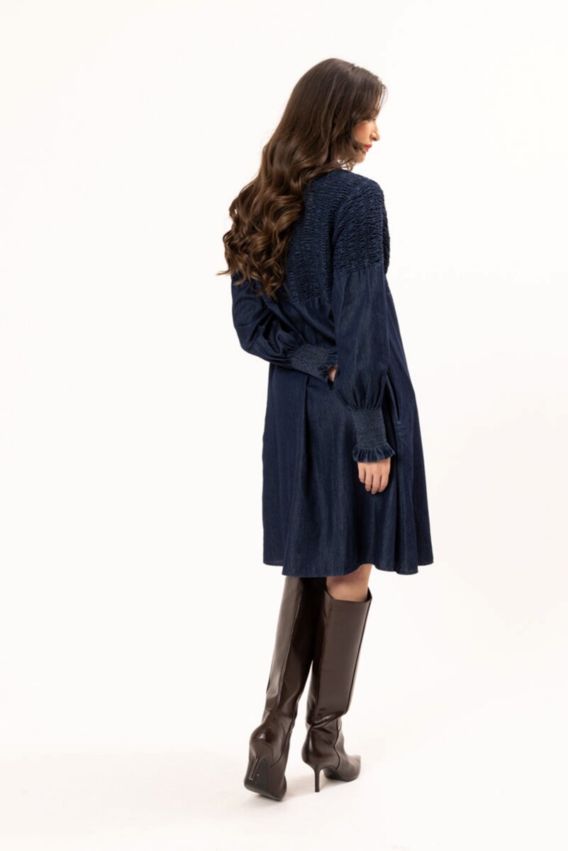 Elevate your everyday wardrobe with the Cheri Dress, a sophisticated take on classic denim. This piece features intricate shirred detailing across the bodice and back, blending structured style with feminine texture. With its rich indigo wash and dramatic blouson sleeves, it’s the perfect effortless statement piece.