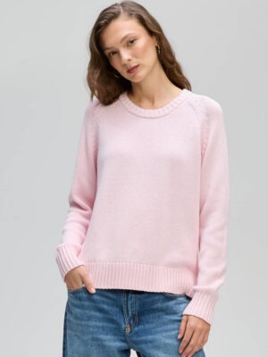 A chunky crew designed for effortless weekend wear. Detailed stitching runs through the raglan sleeves, adding quiet character, while a contrast colour at the neckline gives subtle hanger appeal. Finished with a textured plain-knit patch at the back for an understated detail.
