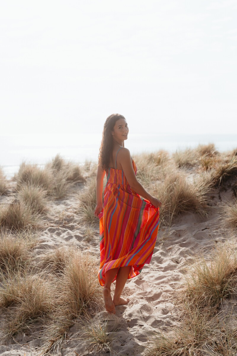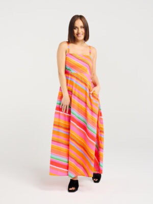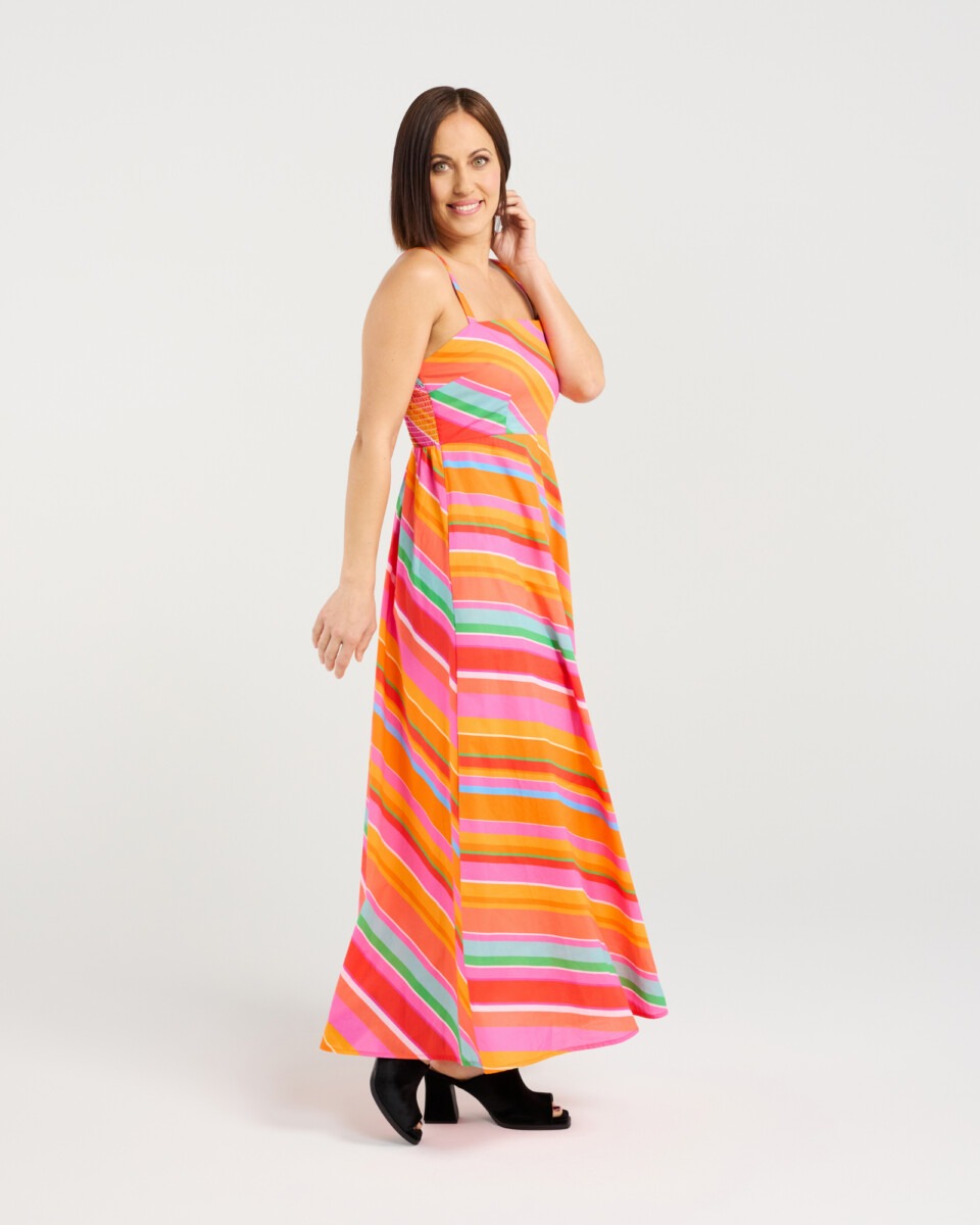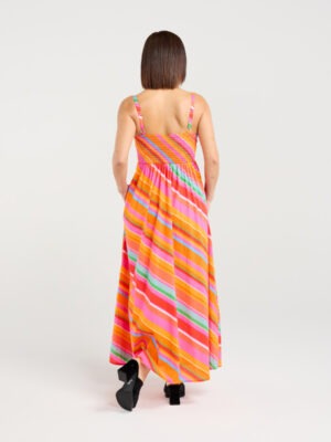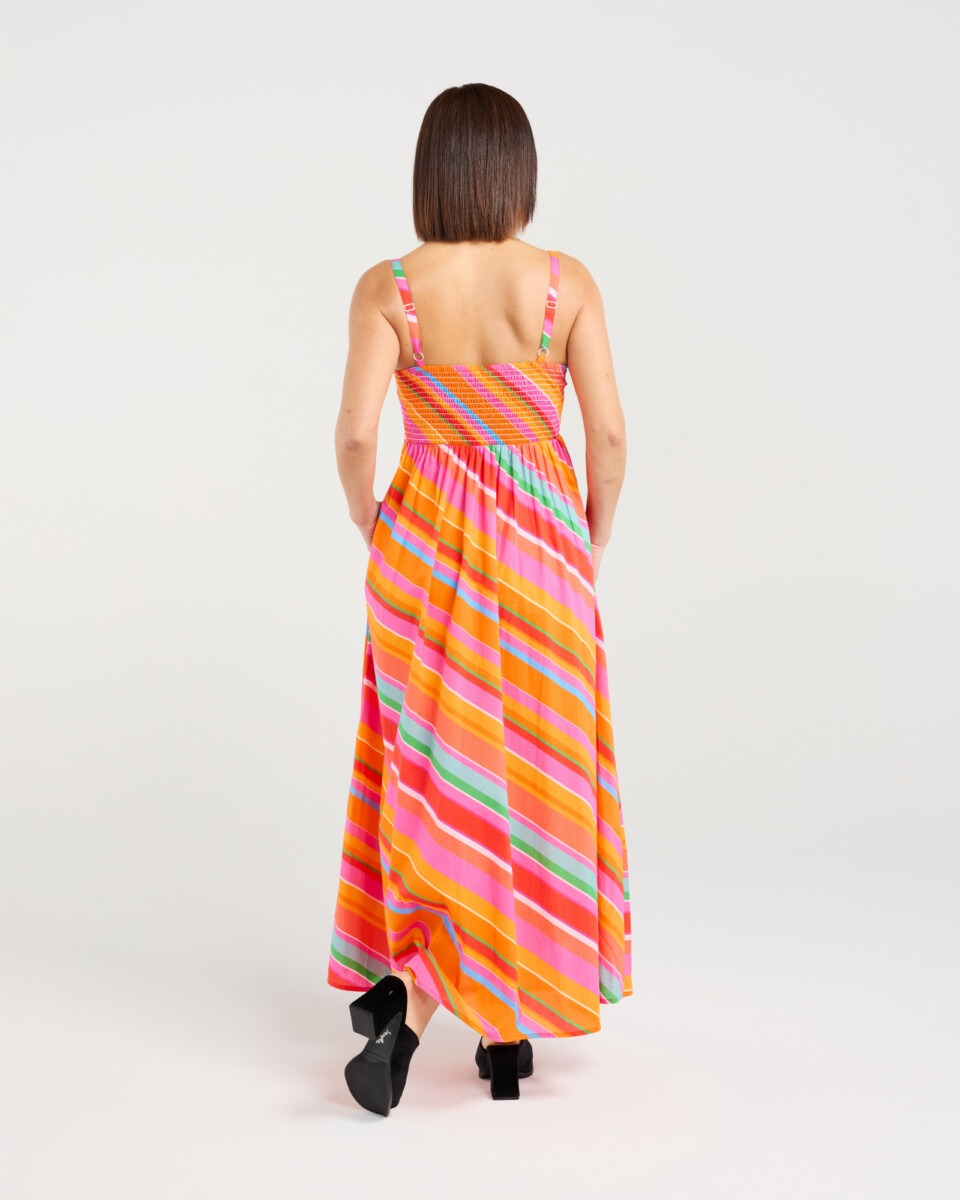 A bold beauty for sunny days, this strappy summer dress features a fitted bust with elastic at the back for a comfortable, flexible fit. The flared skirt adds movement to the simple, elegant silhouette, all brought to life in vibrant, colorful fabric.