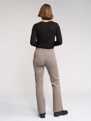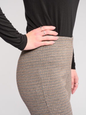 Pull-on pant in the Cedar HT pattern — a mini houndstooth in black and cedar on an oat base. Designed in a stretch fabric for comfort, this style features an elasticated waistband and softly flared hems for a polished yet easy silhouette.