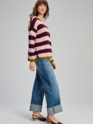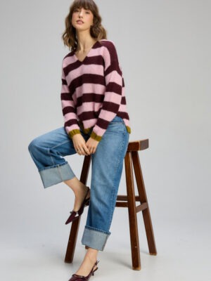 Introducing the Cozy Kid Stripe V Jumper from Zaket & Plover. This jumper delivers cosy, contemporary charm with soft blush stripes finished with a contrasting olive hem.