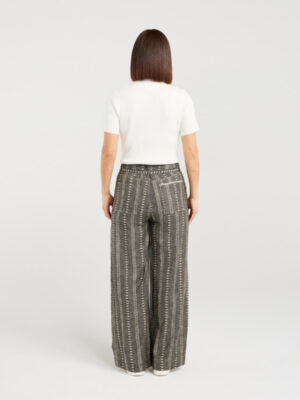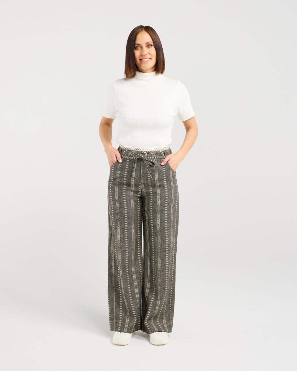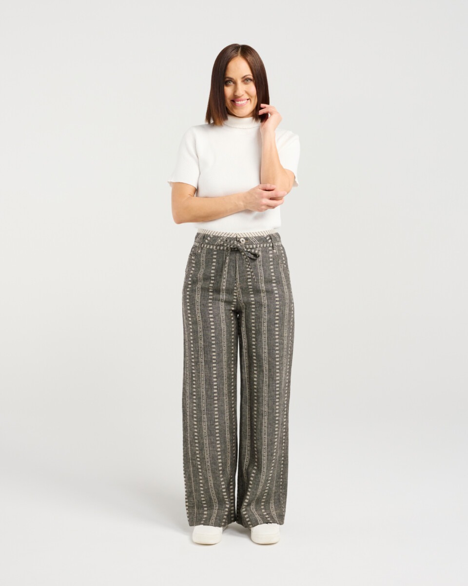 These cotton pants feature a modern, vertical stripe design for a sleek, elevated look. With a button closure and drawstring waist, they blend tailored style with comfortable, adjustable wear—perfect for effortless winter dressing.
