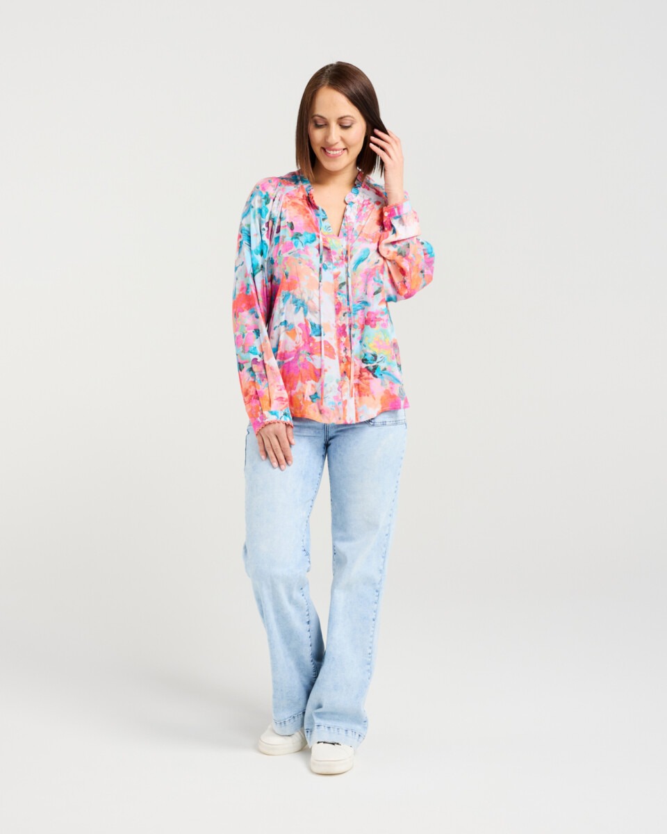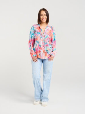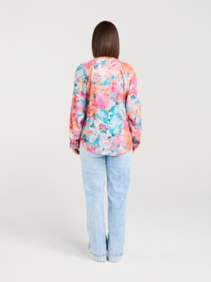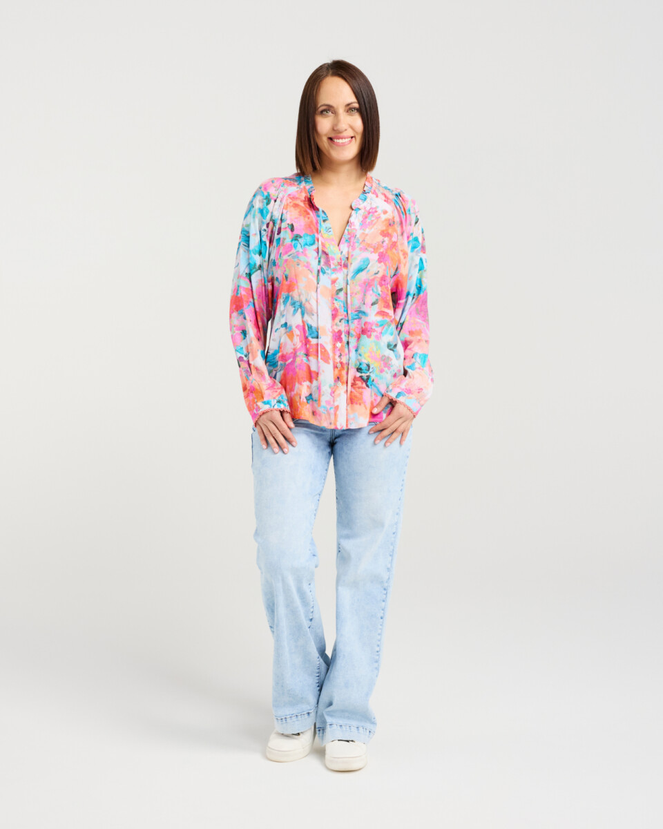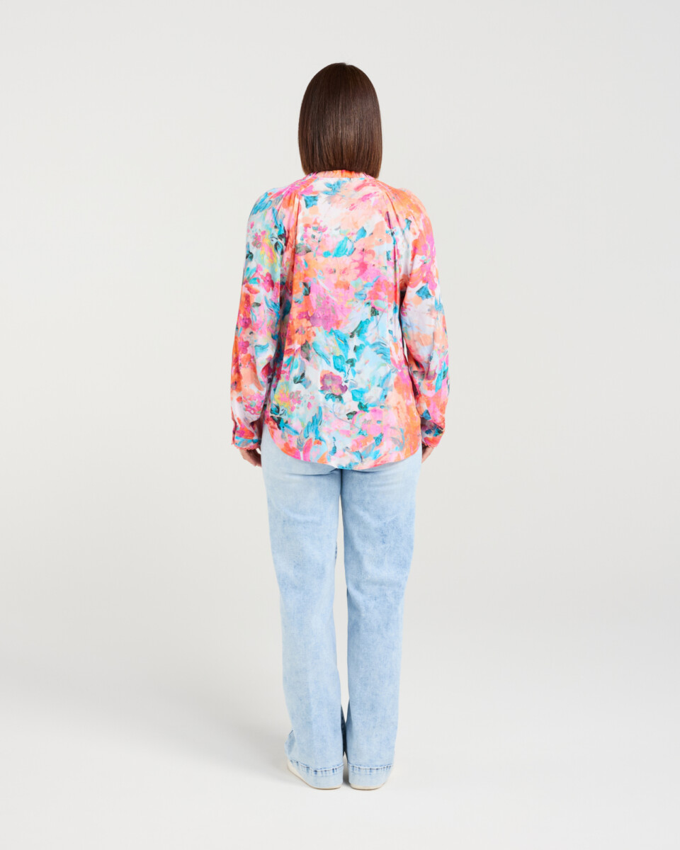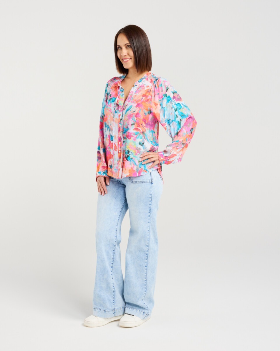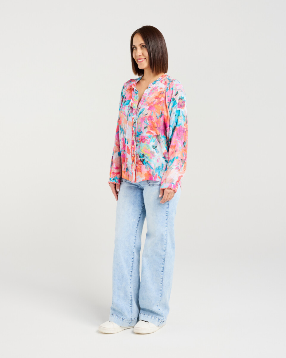 This button-down blouse features a V-neck with a subtle neck trim and delicate ties for a soft, feminine touch. Small trim details around the arm cuffs add refined elegance, making it a versatile piece for polished winter outfits.