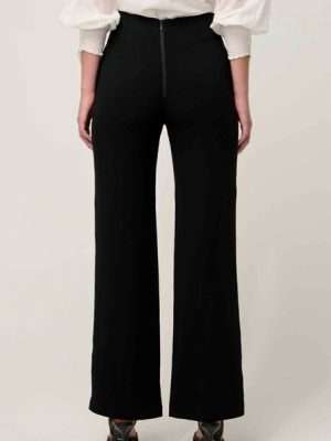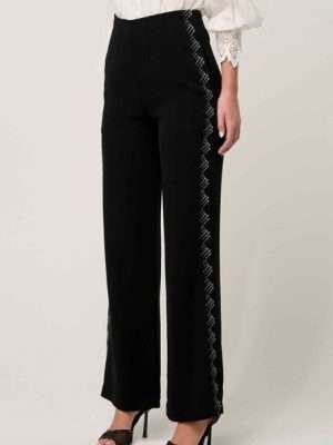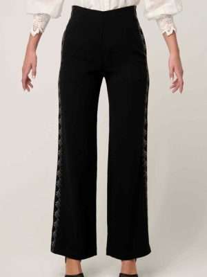 Step into effortless elegance with the Elvira Viscose Stretch Crepe Pant in Onyx. Designed for the modern woman who commands attention, these high-waisted, wide-leg trousers exude sophistication with their sleek silhouette and delicate embroidery cascading down the sides.