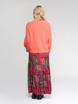 Oversized knit sweater in Lava, a vibrant orange, crafted from a soft blend including mohair and wool for warmth and texture. Featuring raglan balloon sleeves and a round neckline, this sweater offers a relaxed, statement making silhouette with a cosy, luxurious feel.