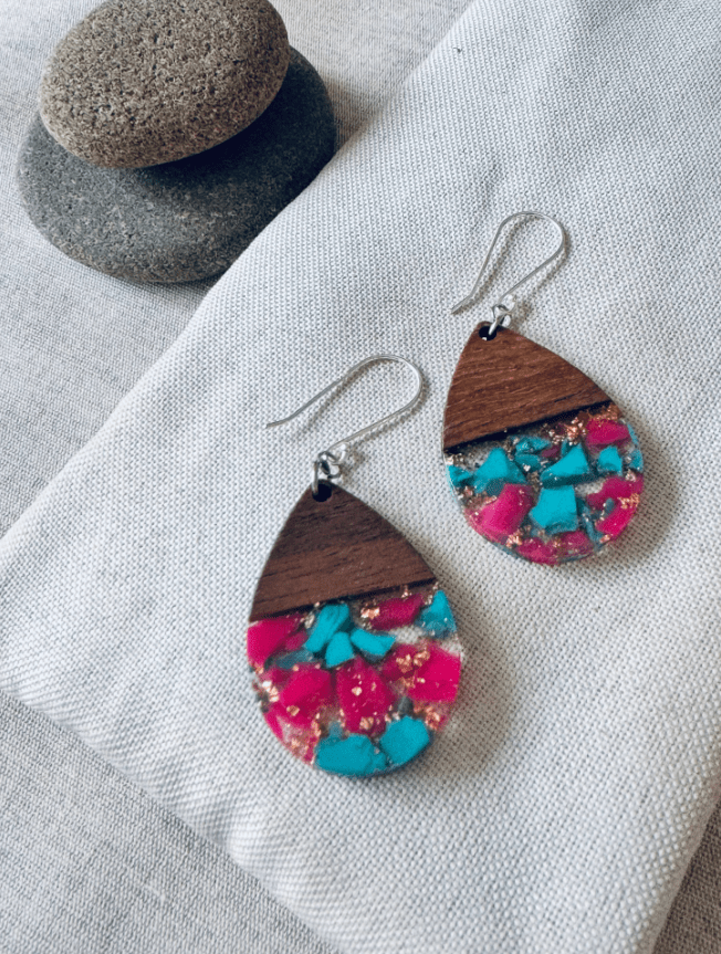 Wood resin and sterling silver earwires. Bright pink and blues.