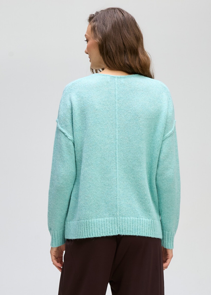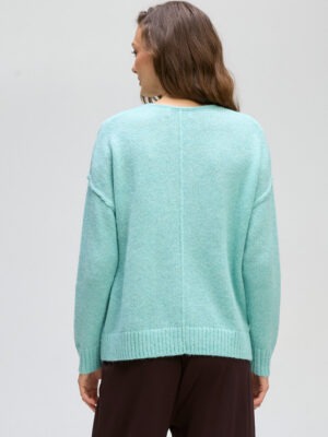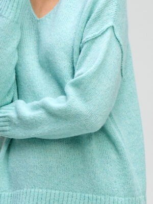 A simple, cosy V-neck with exposed outer seams for a relaxed finish. Made in a beautifully soft yarn at a fantastic price. In a beautiful light seafoam colourway.