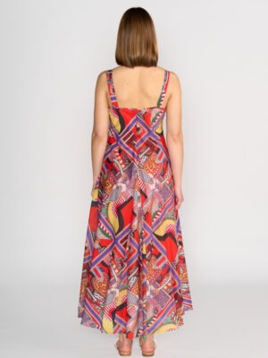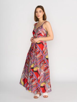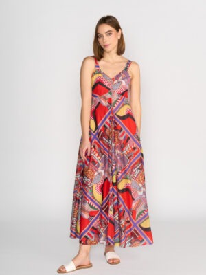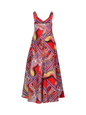 This full-length floaty summer Gala Dress features the bold Cleopatra print and is made from a lightweight viscose-nylon blend with a soft cotton lining. The dress is shaped through the bust and waist and flows into a relaxed, breezy skirt, perfect for warm days and effortless style.