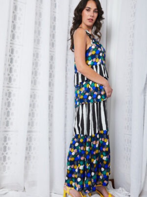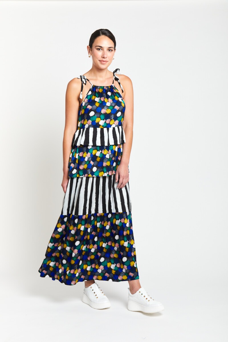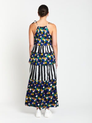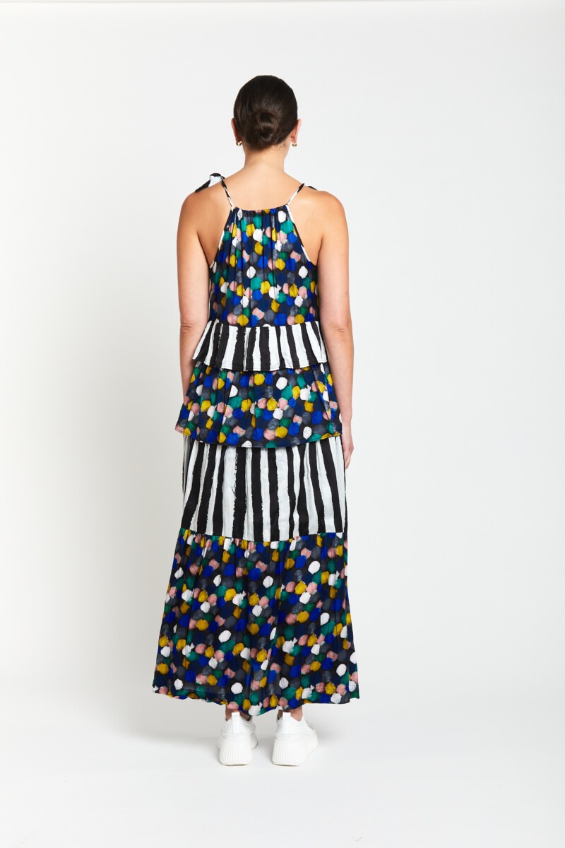 A celebration of colour and form, playful yet polished, the Gelato Tier Dress is elegantly composed of a soft satin viscose, selected for its beautiful drape and movement. Adjustable ties at the shoulders offer a personalised fit, while tiered panels alternate between the vibrant Gelato print, featuring a confetti of colours, pops against the rich black base and bold black and white stripes creating visual contrast and eye-catching fluidity. Light, floaty, and full of personality, this dress moves gracefully with every step. A true statement piece for effortless styling.