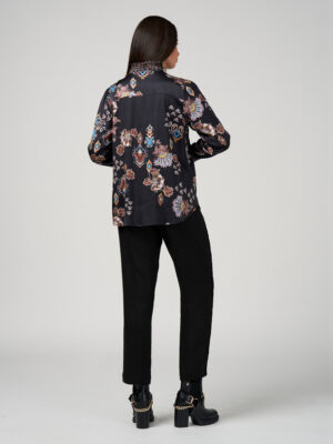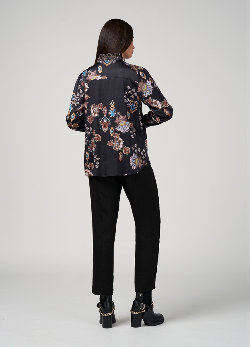 Stretch sateen blouse iwth an edge to edge self covered button and loop front placket. Shirred romantic collar and button cuffs.