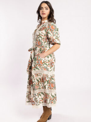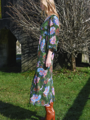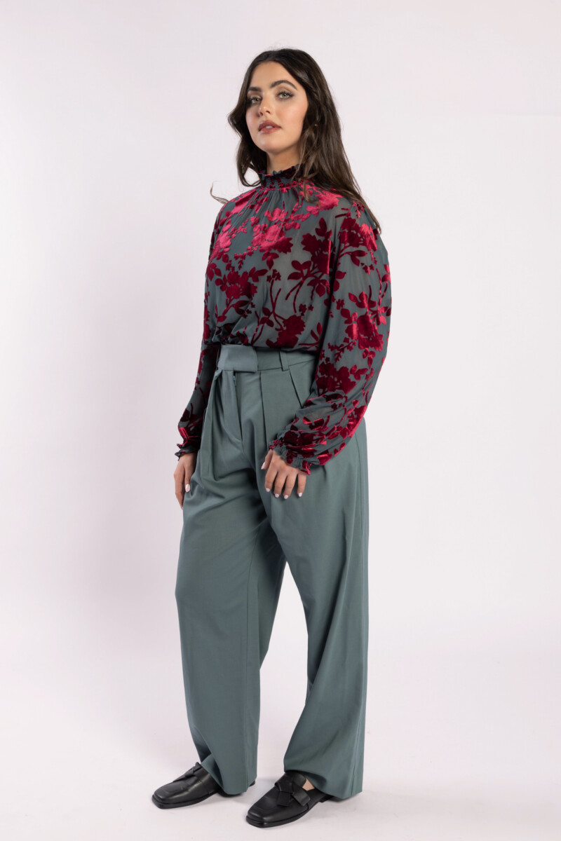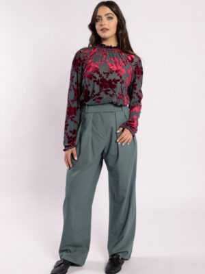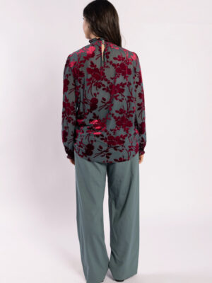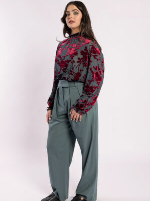 The highly sought-after Heidi Blouse is back, this time in a stunning velvet fabric, the base is a steel colour and the velvet flowers are a rich burgundy. This blouse features a charming lace detail on the sleeve and a double button back neck with elasticated neck detail, making it perfect for any occasion. Whether you’re heading to the office or out for a night on the town, this versatile piece can easily transition from day to night.