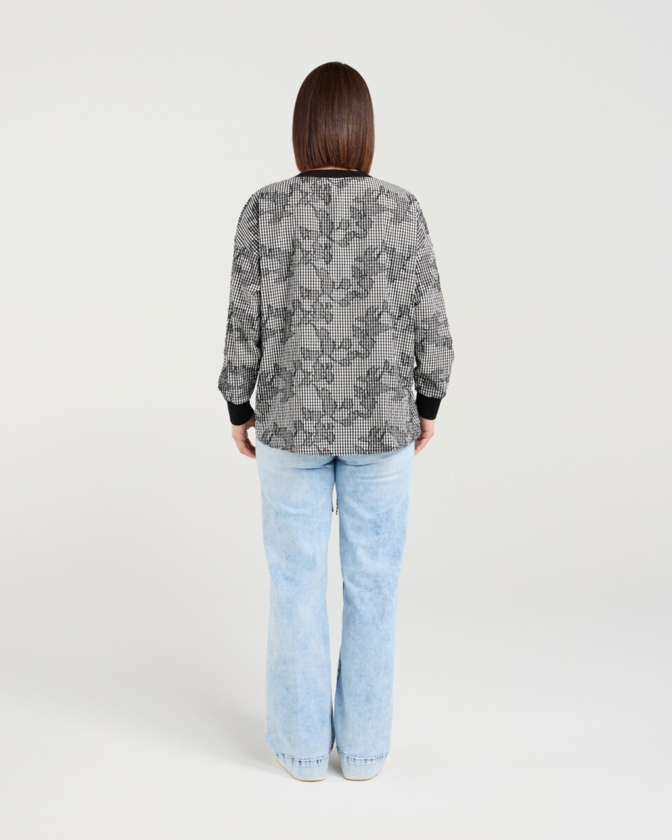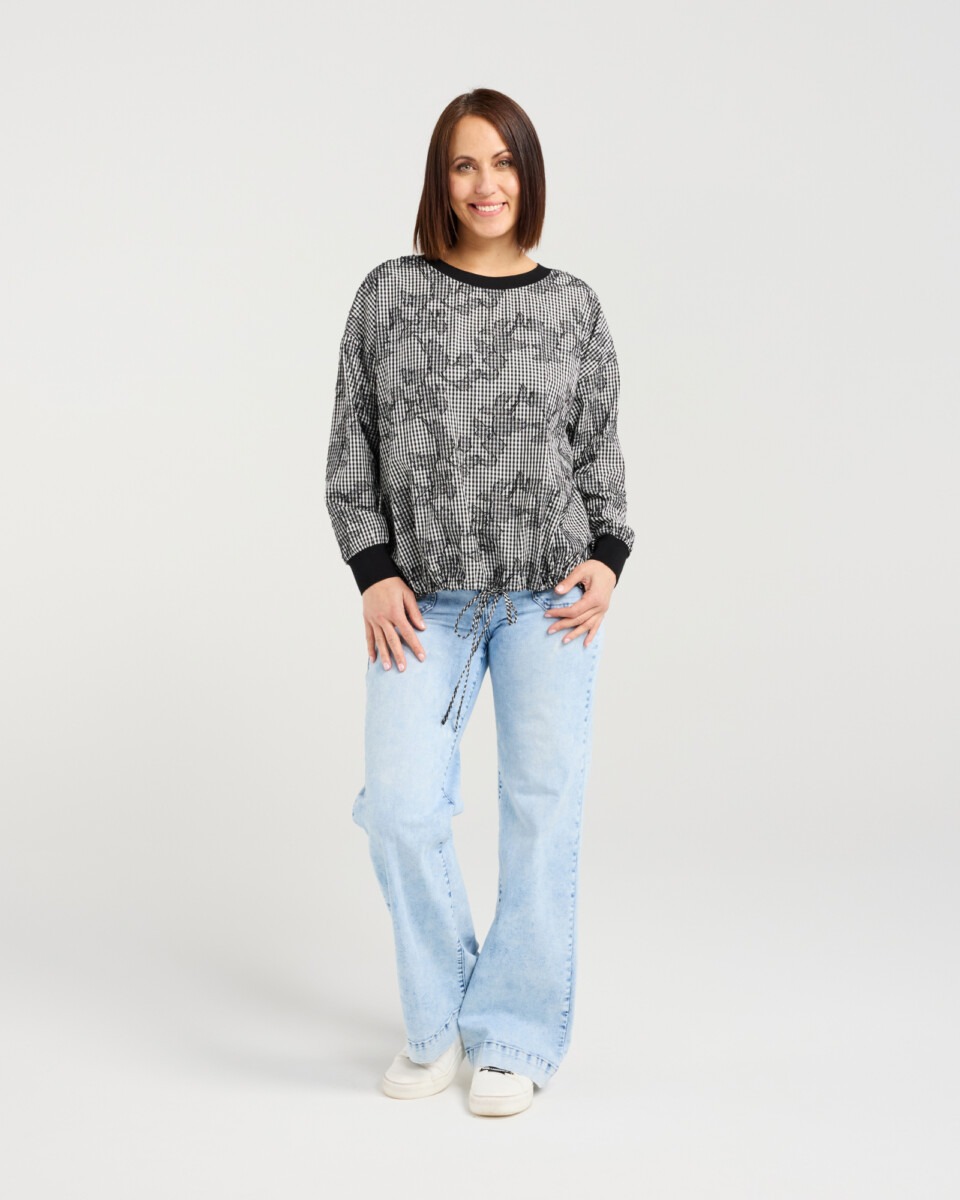 This long-sleeve top features elasticated arm cuffs, a slight side split, and a front hem drawstring for a relaxed, adjustable fit. Crafted in modern check fabric, it combines contemporary style with effortless comfort, perfect for winter layering.