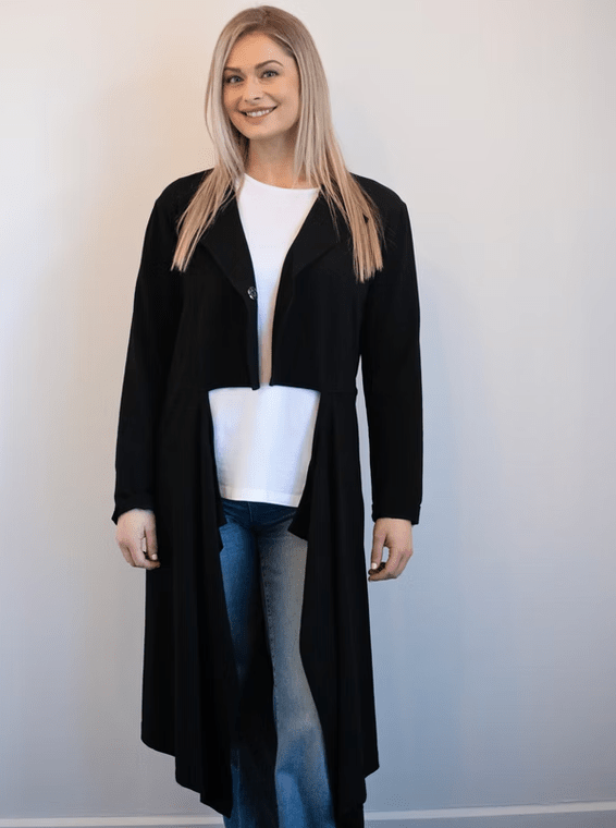 NZ designed. Your statement jacket just landed. Introducing the Julie Jacket. Crafted in 100% cotton, this lightweight jacket is cropped at the front waist and falls beautifully to the knee. The perfect trans-seasonal layer for you, in classic black so will pair back with everything in your wardrobe.
