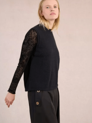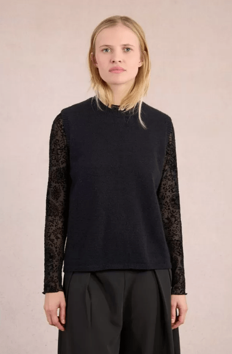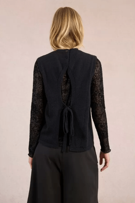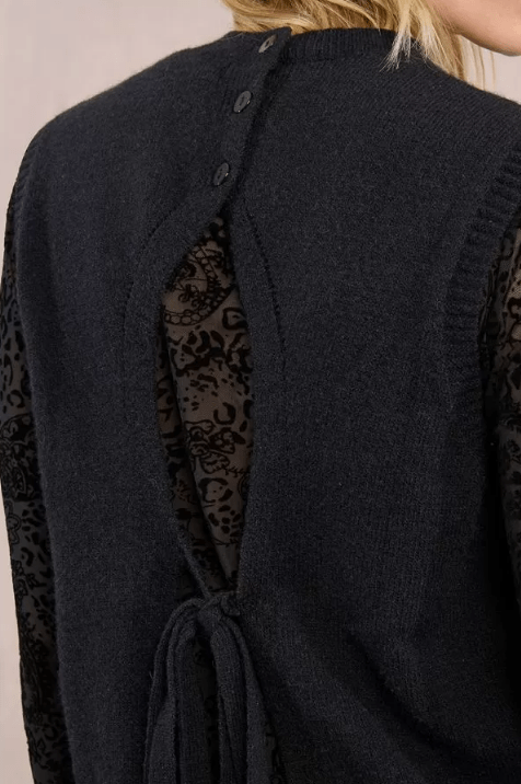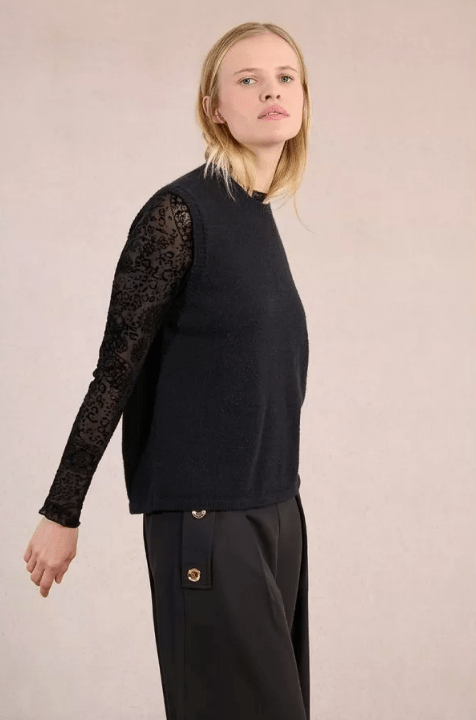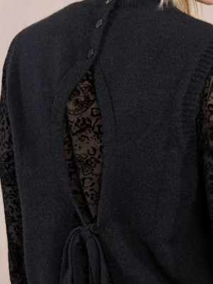Designed in France. Jump on trend with this cute sleeveless sweater with gorgeous back detailing. A straight fit, and high neckline. This sweater is buttoned at the upper back and slit at the back.