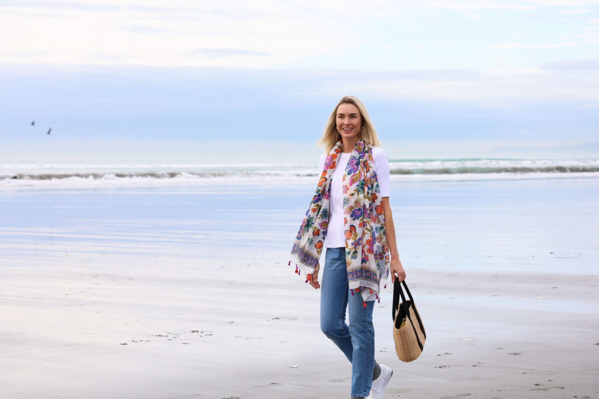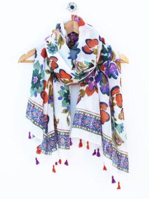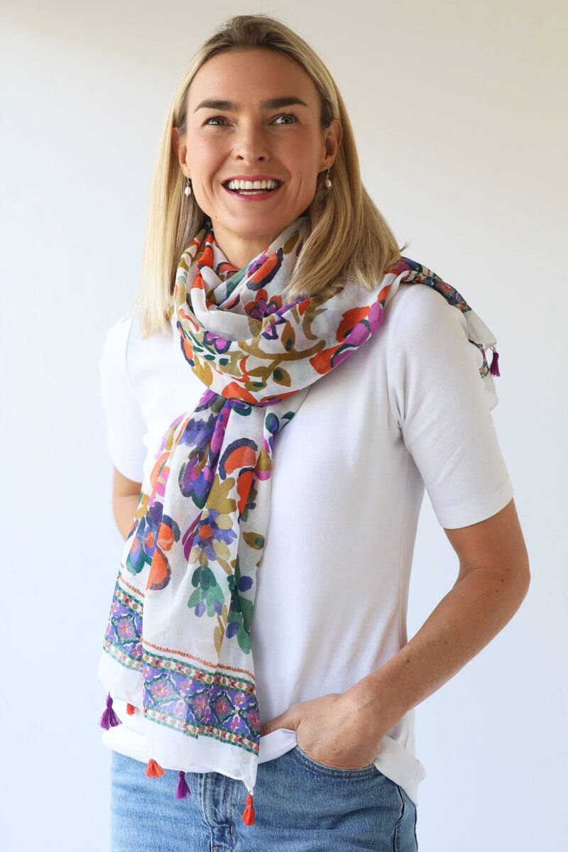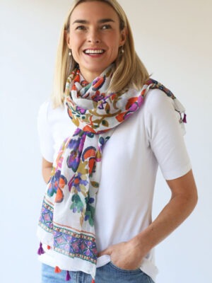 Crafted in 100% Viscose, this soft white based scarf is filled with a multitude of colour, meaning you can pair it back with so many colours and options.