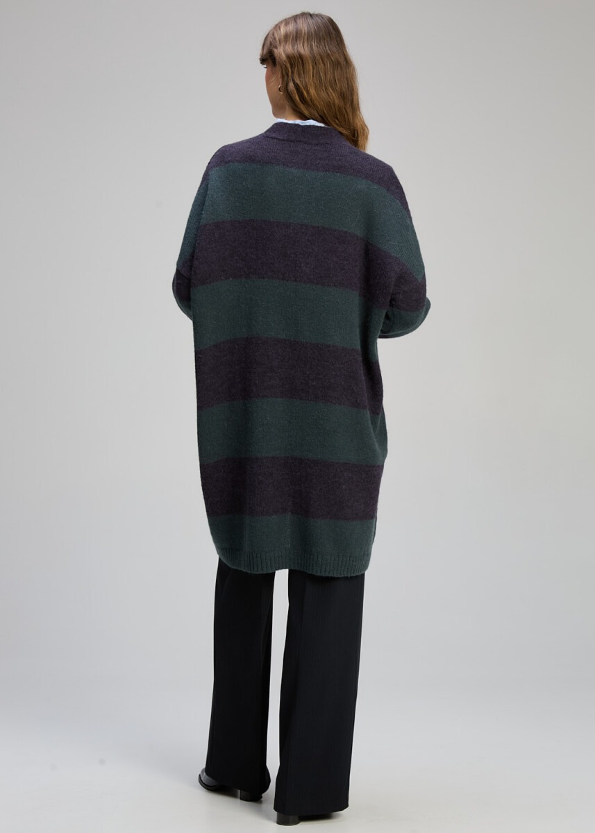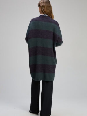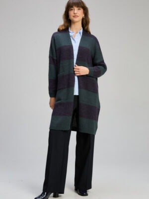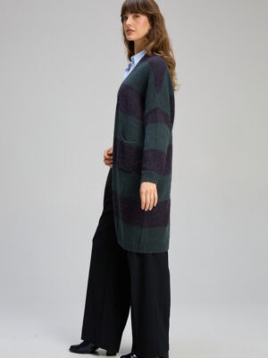 An easy wear long line cardi with sweet patch pockets. Stripe in a gorgeous forrest and navy. A great transitional weekend staple for your wardrobe.