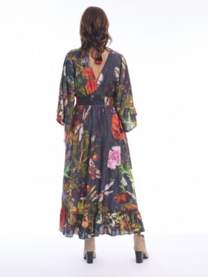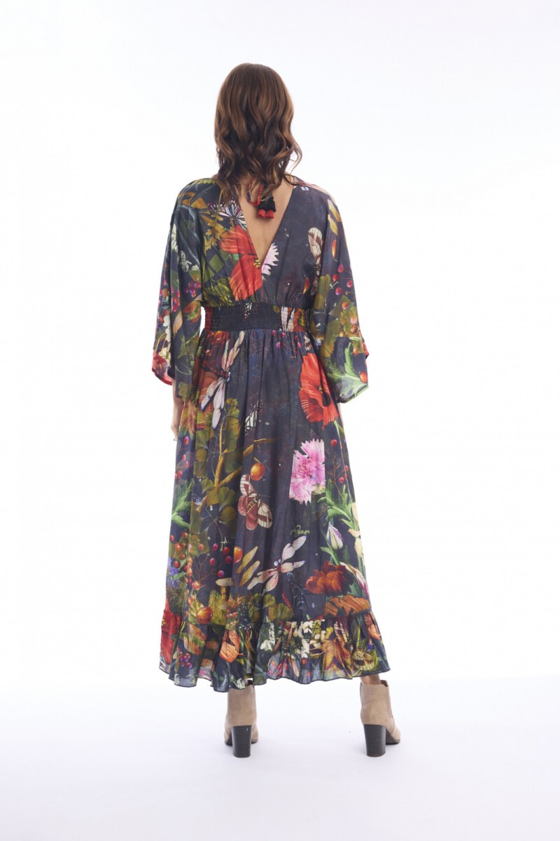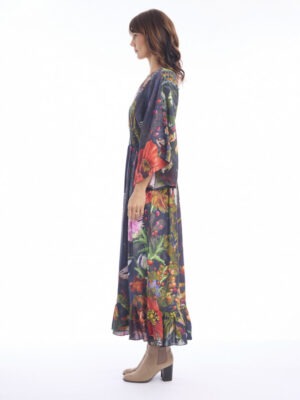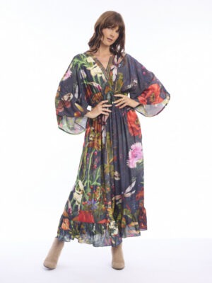 Effortlessly elegant, this maxi-length dress is crafted from 100% rayon for a soft, breathable feel. The relaxed A-line silhouette flows into tiered layers, creating graceful movement and a flattering drape. A V-neckline is accented with decorative embroidered trim and subtle bead or sequin embellishments, while the three-quarter sleeves feature gentle puffing at the shoulders and contrasting cuffs for added charm. Functional side patch pockets complete the look with practicality. Designed to transition seamlessly from casual outings to relaxed evenings, this dress combines comfort and style with ease.