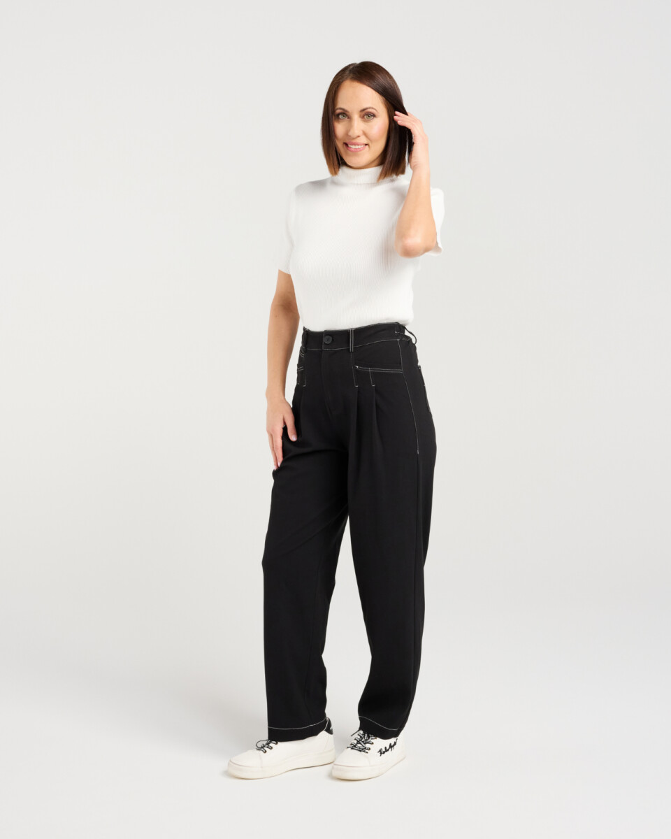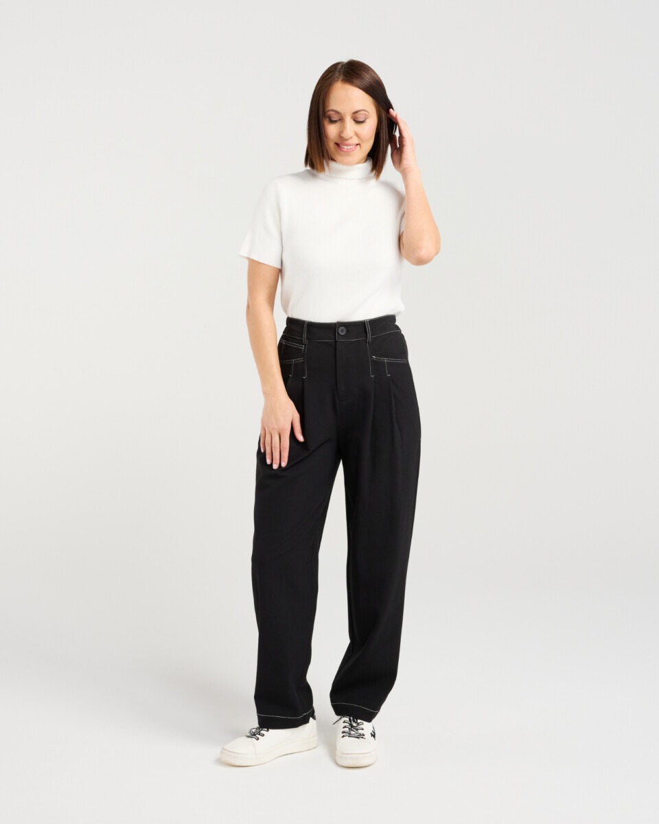 These straight-leg pants feature a button and zip closure with an elasticated back waistband for easy, comfortable fit. Pockets and contrasting stitching add subtle detail, combining style with practicality.