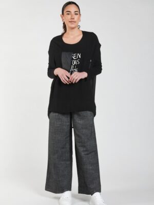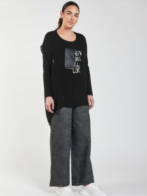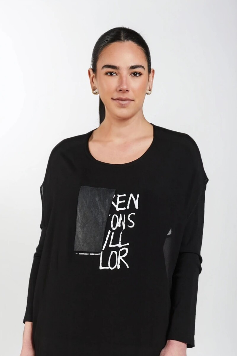 A striking design driven detail adds edge and modernity, an irregular rectangle black panel is overlaid with expressive white handwritten text, creating a graphic focal point that contrasts the the visual anchor of the top, lending a creative, urban tone. This mixed-media detail gives the top its contemporary expressive edge.