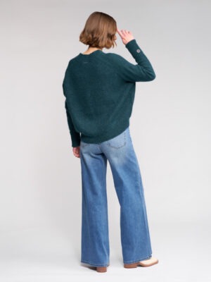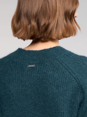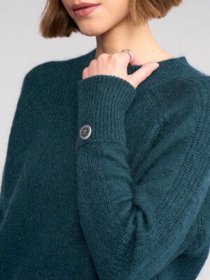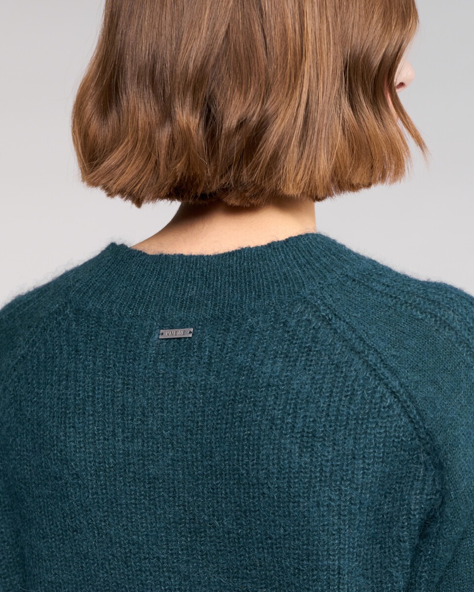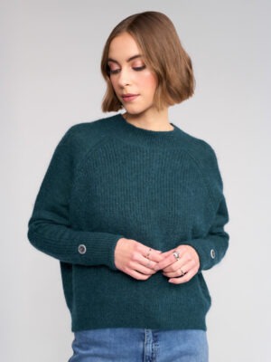 Relaxed-fit knit jumper in a rich Mallard green, crafted from a soft blend including mohair and wool for warmth and texture. Featuring distinctive folded cuffs secured with buttons and a curved hem.