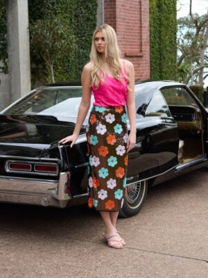 This striking sequin skirt features a shimmering bronze base adorned with intricate blue, orange, and pink floral sequins for a bold, feminine finish. Designed in a flattering midi length, it offers a standard fit with a back centre zip and full lining for comfort and ease of wear. A statement piece that catches the light beautifully, perfect for special occasions or adding sparkle to your evening look.
