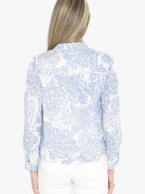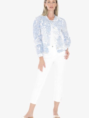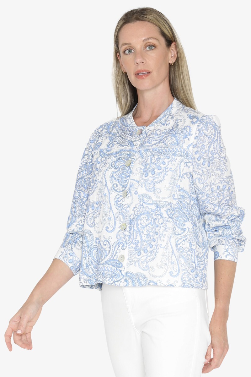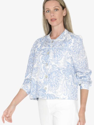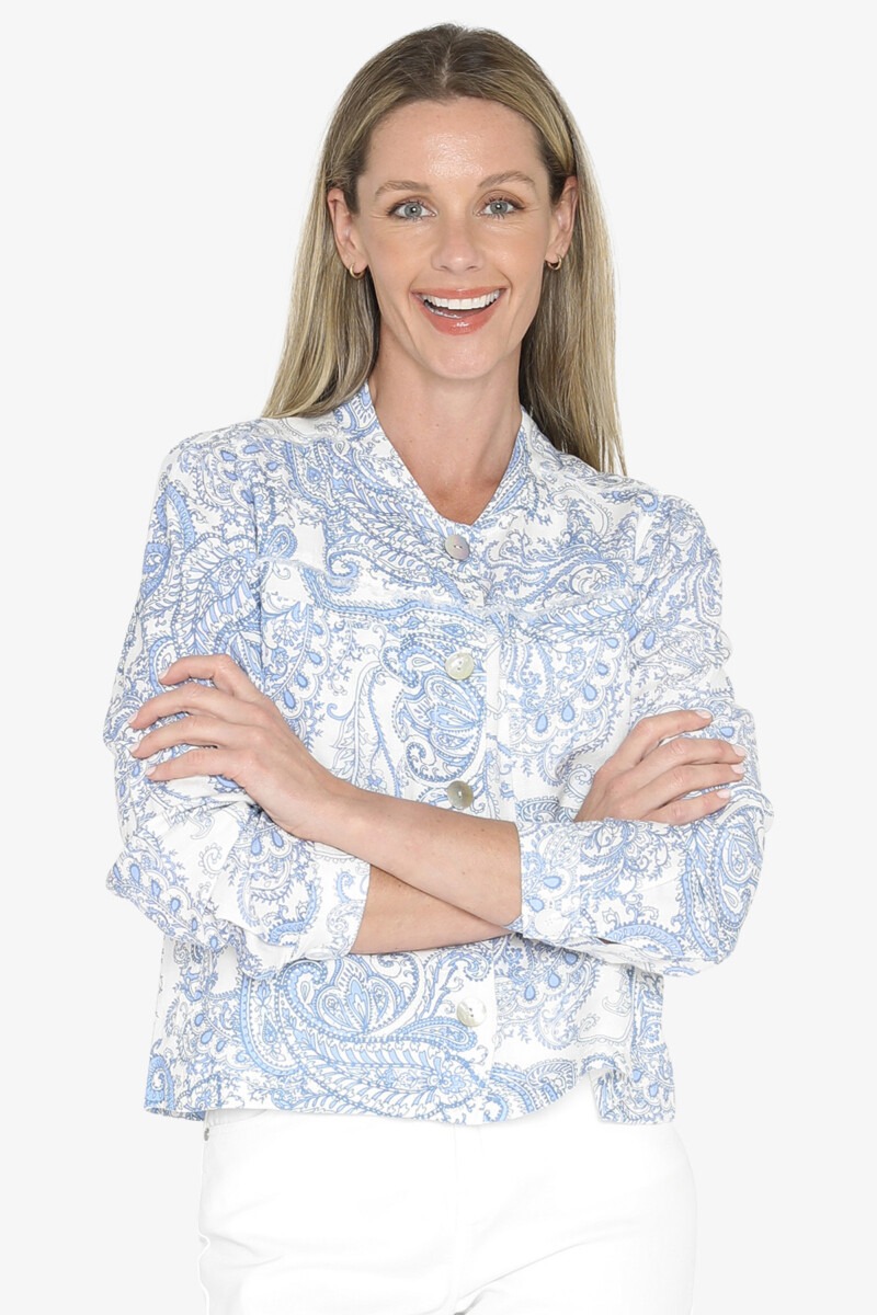 Elevate your wardrobe this season with the new Paisley Print Mykonos Jacket. A long sleeve style, two pocket, shell buttons and crew neck. Linen Viscose Blend.