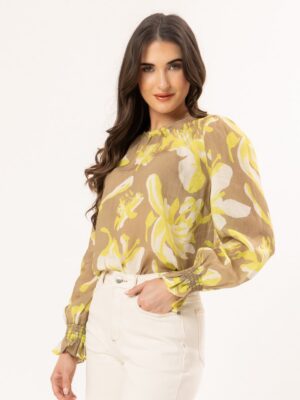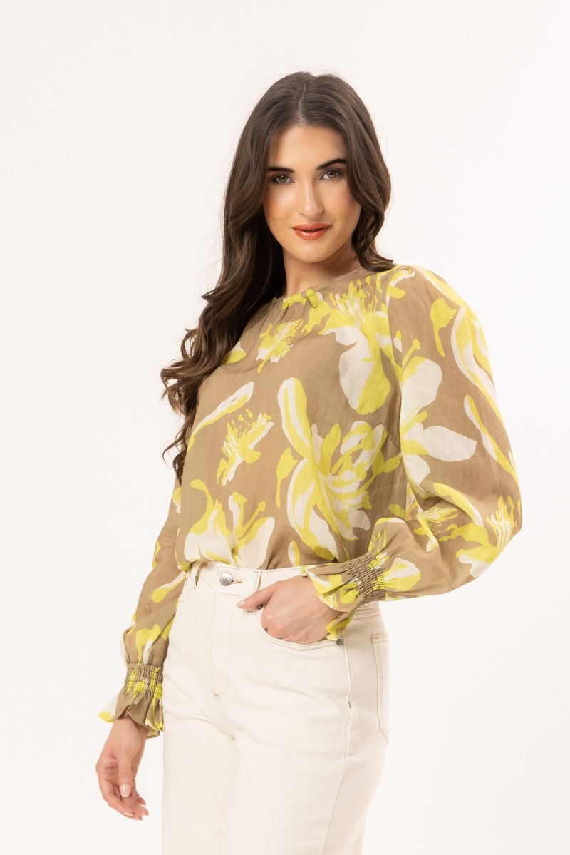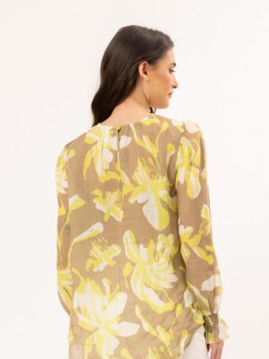 Crafted in 100% Ramie, this gorgeous lightweight top has a taupe base with lime and cream florals.