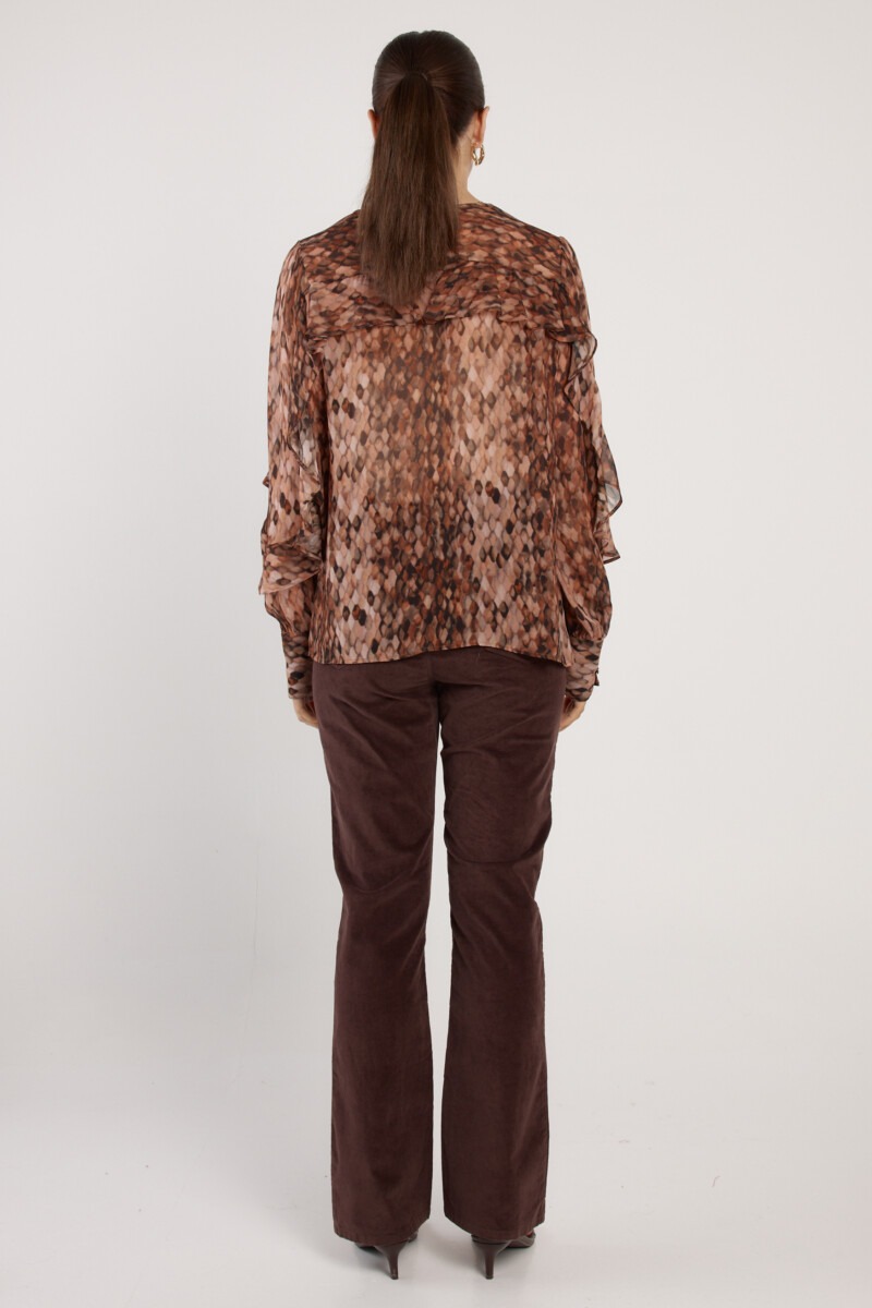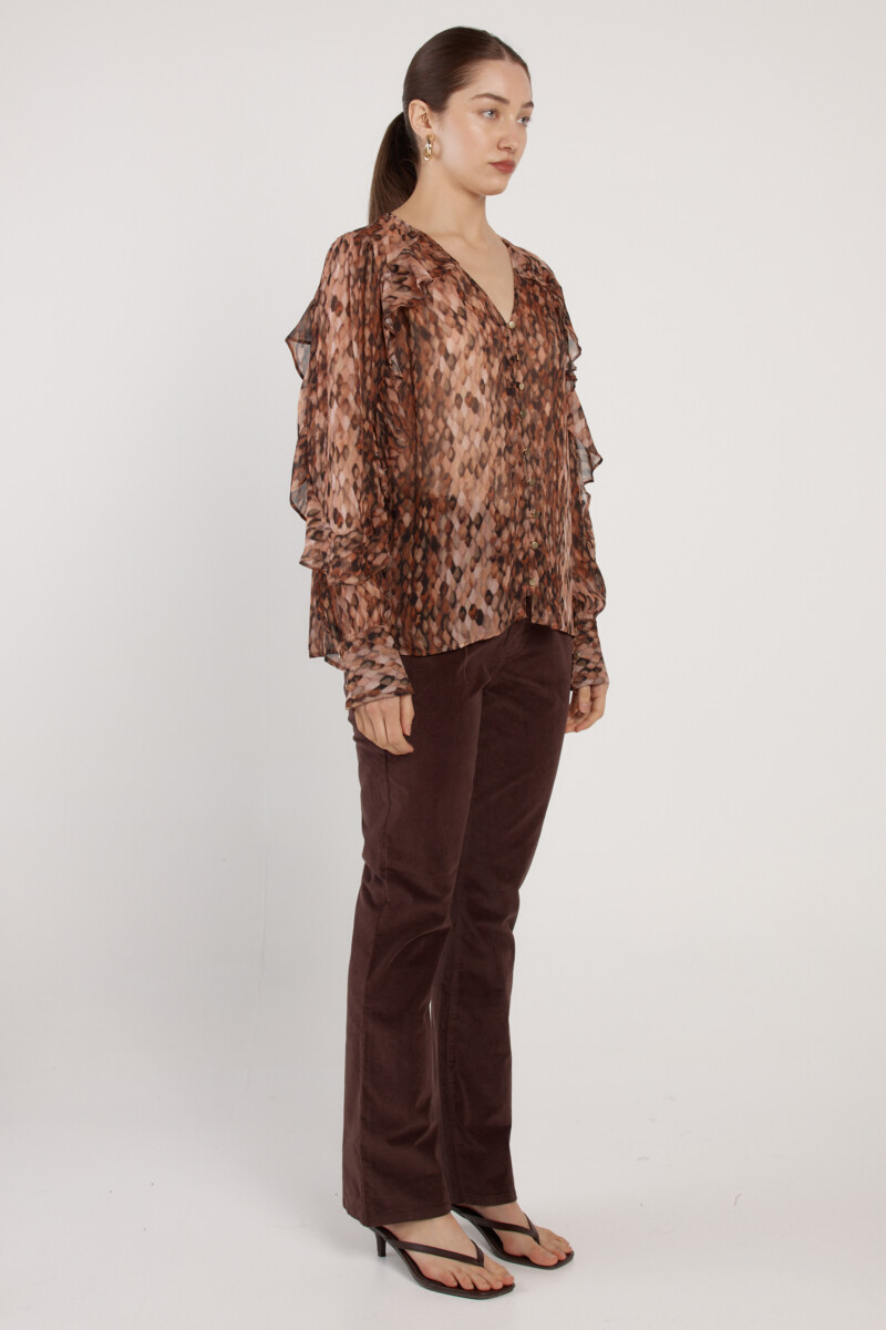 The Odette Ruffle Blouse balances softness with structured elegance. Delicate ruffle detailing frames its sheer silhouette, creating movement and texture. Lightweight and fluid, it layers effortlessly with the included camisole. A sophisticated trans-seasonal piece with elevated charm.