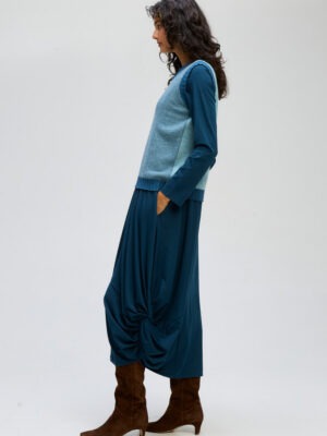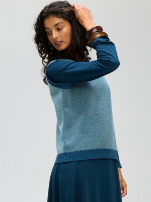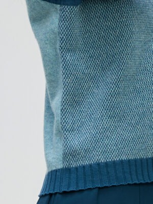 This vest is a stylish, patterned crew neck vest featuring ribbed trims, designed for autumn layering. It is produced by the Melbourne-based knitwear label LD & Co, which is known for its high-quality knitwear and is a sister label to Zaket & Plover. In a divine seafoam colourway, (a light, greenish-blue shade) it’s beautiful addition.