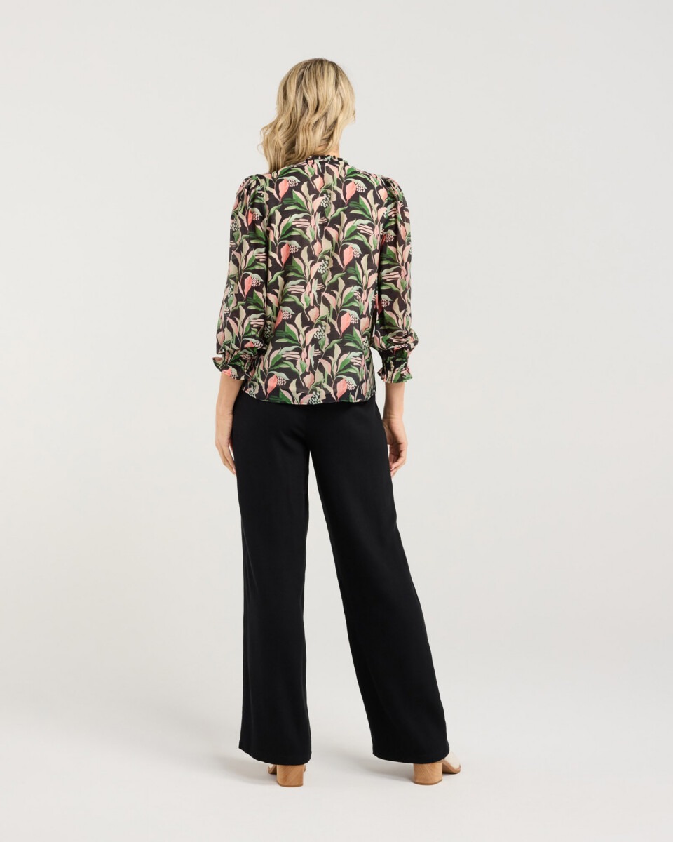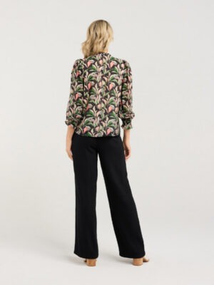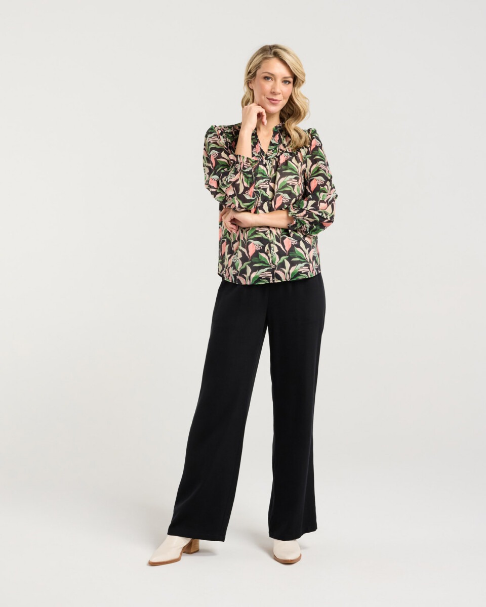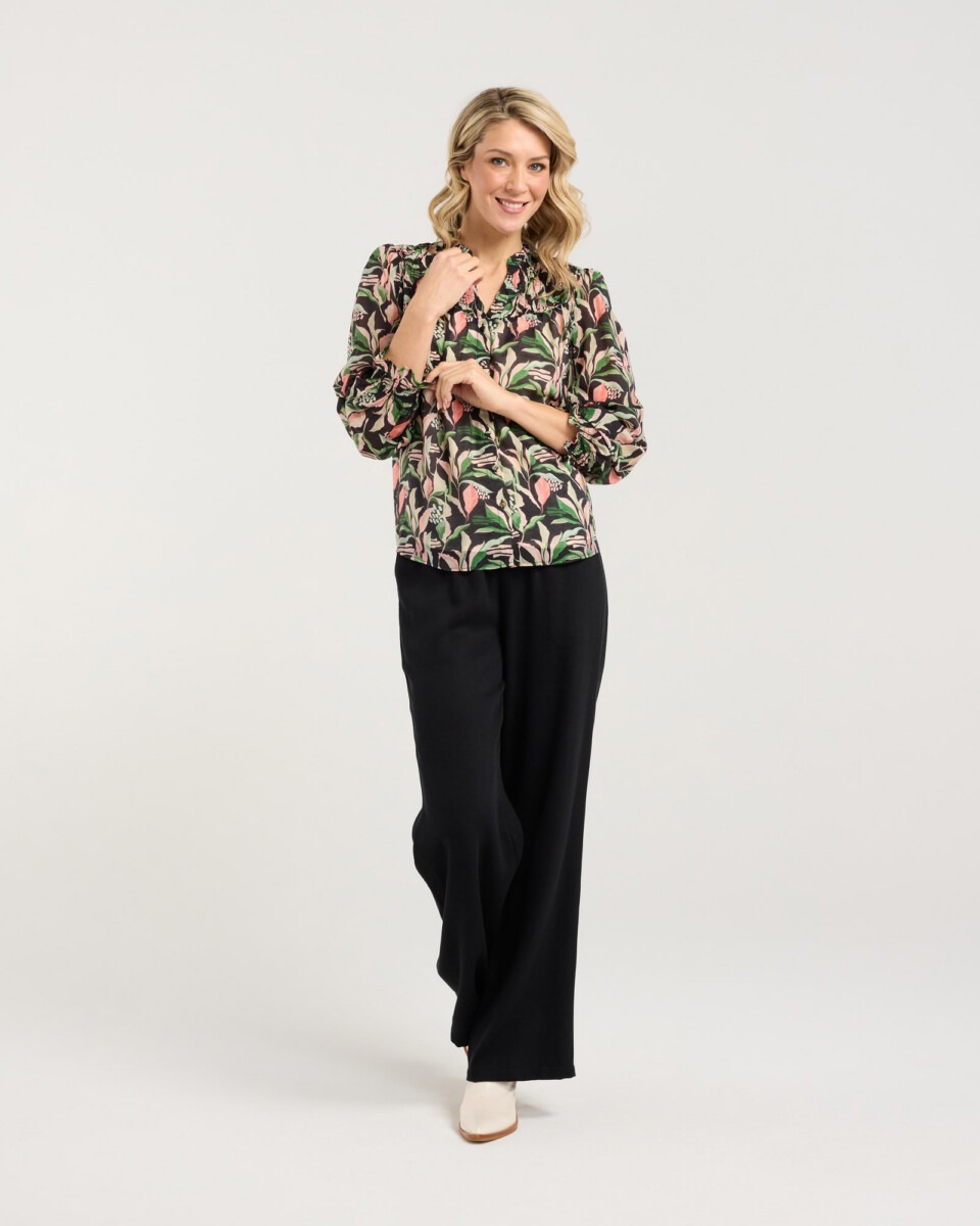 Meet your new favourite closet staple: the Patti Stitched Pleat Blouse. Perfectly balancing sophistication and comfort, this blouse features shirring on the shoulder and top of the chest along with a flattering ruffle neck. Whether you’re powering through a day at the office or stepping out for a casual lunch, this top,, seamlessly adapts to both your busy schedule and your need for effortless style.