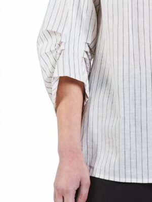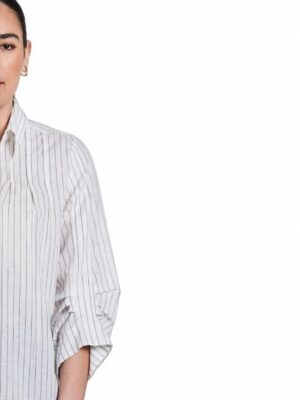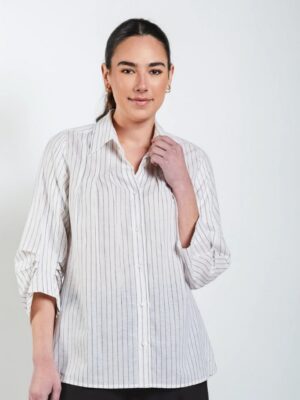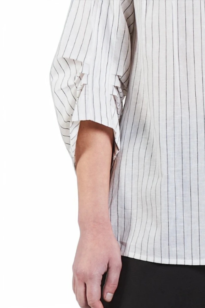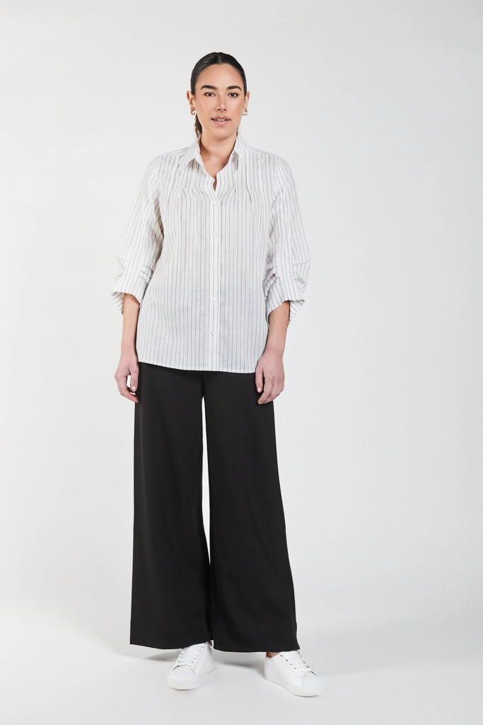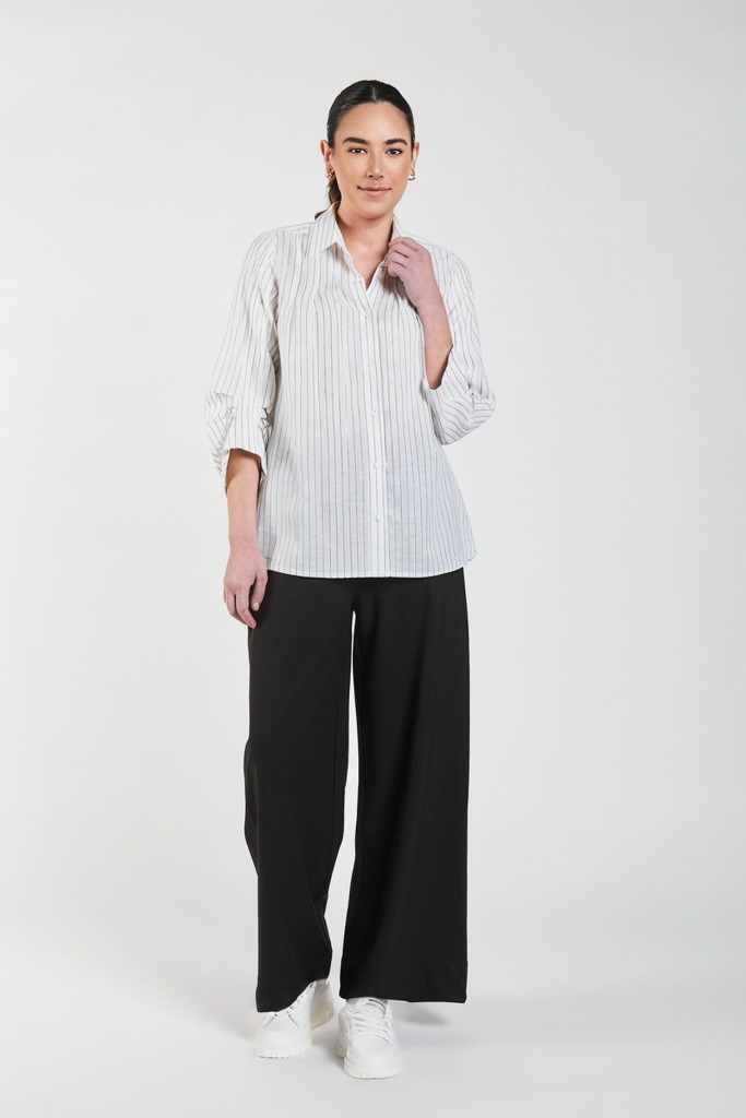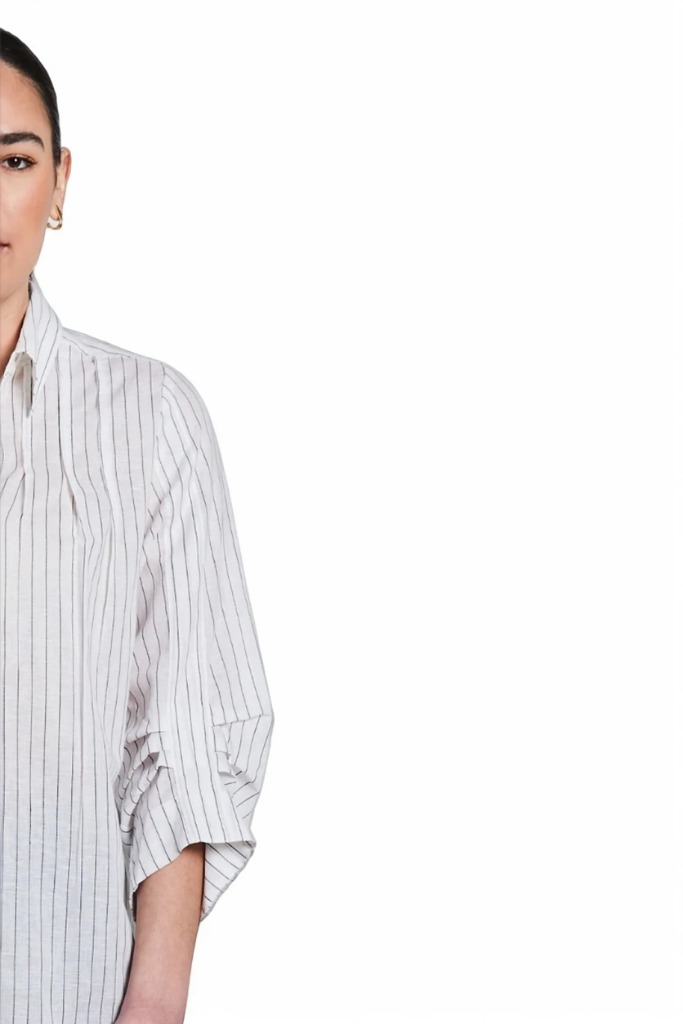 The Broadway Pinstripe Pleat Shirt blends tailored polish with everyday ease. Crafted from a beautifully soft, cotton-linen blend, the shirt features a crisp white base overlaid with fine black pinstripe, delivering a clean aesthetic that feels both modern and classic.