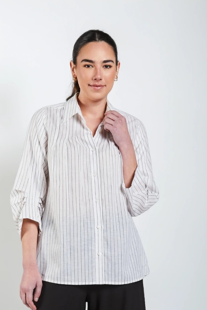 The front is softly elevated with delicate pin tuck detailing along the bodice, adding subtle texture and a flattering vertical line that enhances the shirt’s feminine silhouette, complemented by a full button-through placket for clean, functional ease. A point collar soften the look, giving it a relaxed, feminine finish.