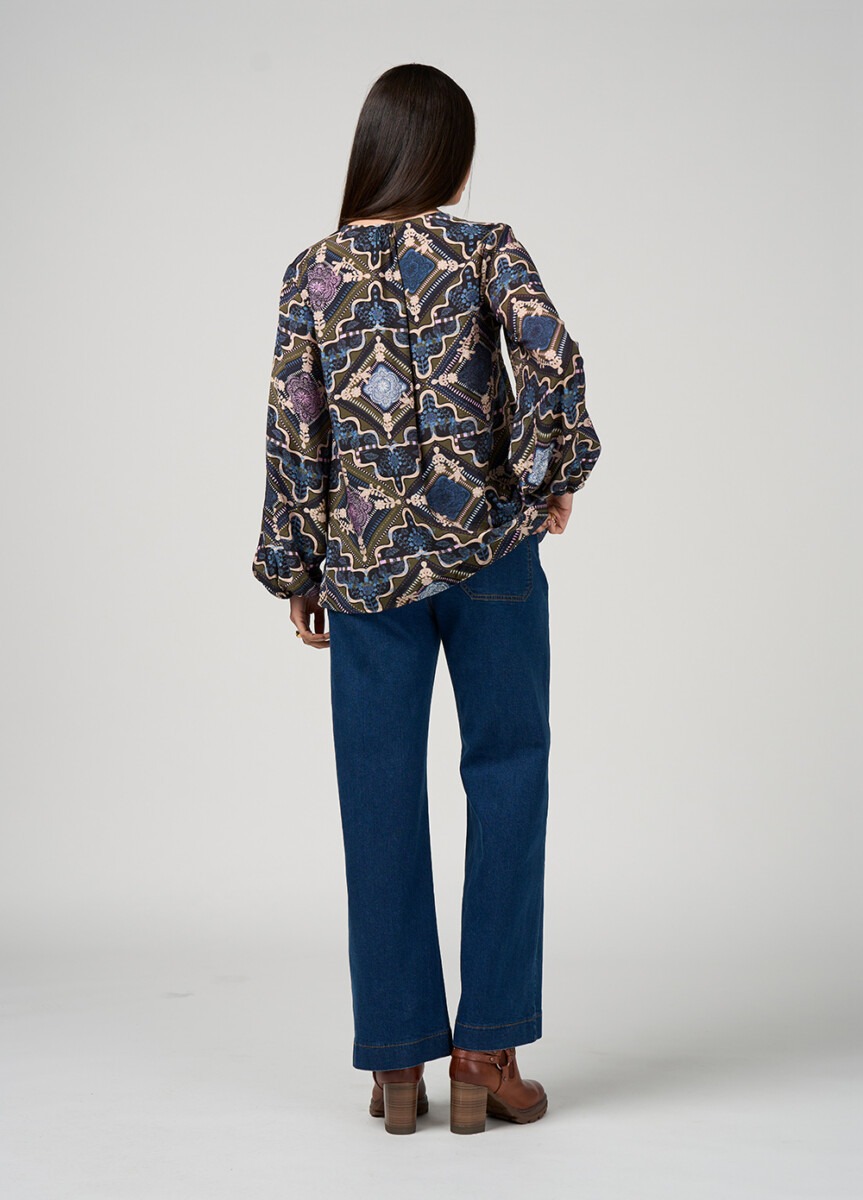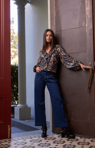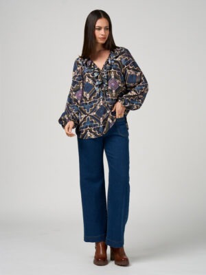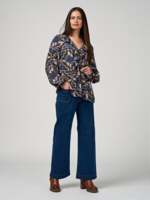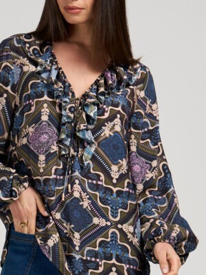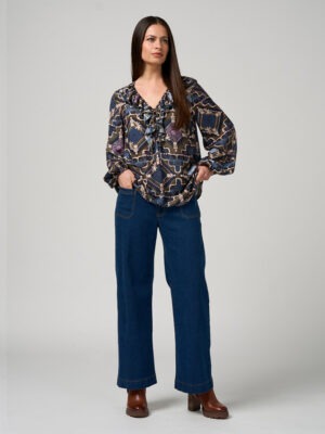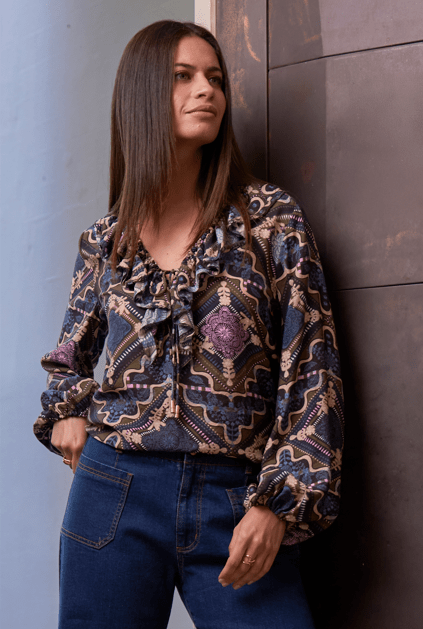 A romantic, floaty blouse featuring a deep V-neckline with delicate front ruffle, secured by a hook & eye and tie detail. Finished with voluminous blouson sleeves and soft elasticated cuffs for an effortlessly feminine silhouette.