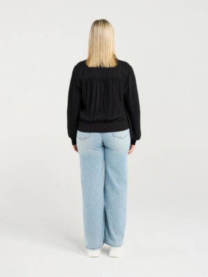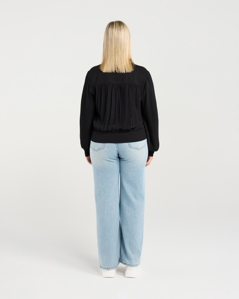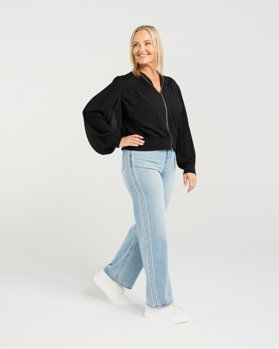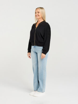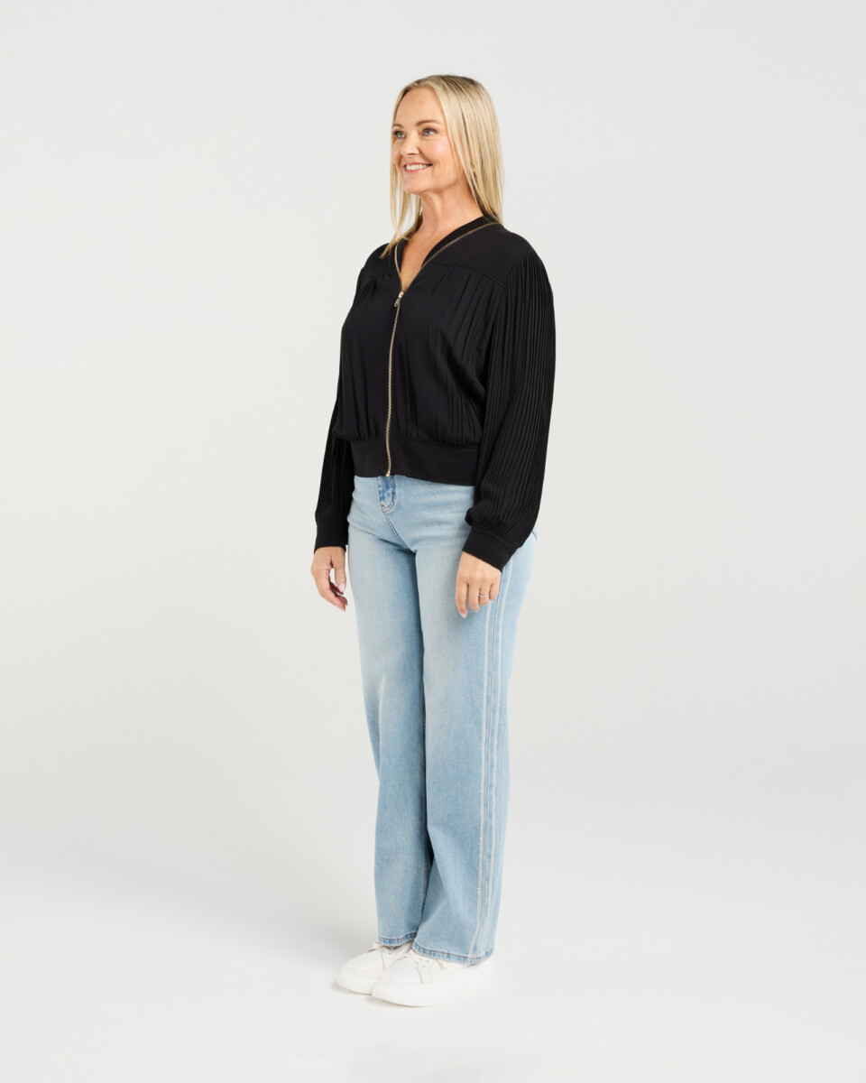 This luxurious bomber jacket offers a unique, flowy feel with its beautifully draped chiffon fabric. Voluminous, airy sleeves create soft movement, giving the classic bomber silhouette an elevated twist. In timeless black, it pairs effortlessly with everything, making it a standout layering piece for any winter look.
