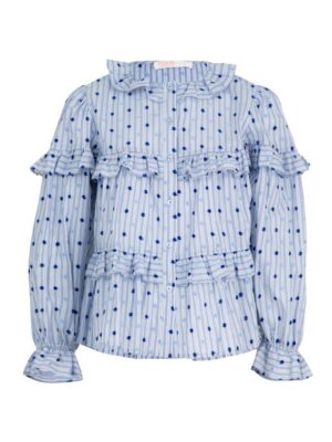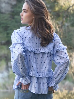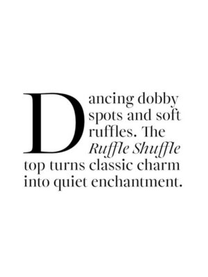 Delicate dobby spots dance across the ‘Ruffle Shuffle’ top, crafted in ‘Dobby Does It’ cotton dobby stripe suiting. A soft ruffle collar frames the neckline, while gathered sleeves and subtle trim details create gentle movement, turning a classic silhouette into a quietly enchanting piece.