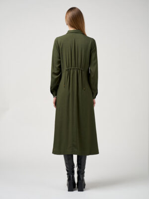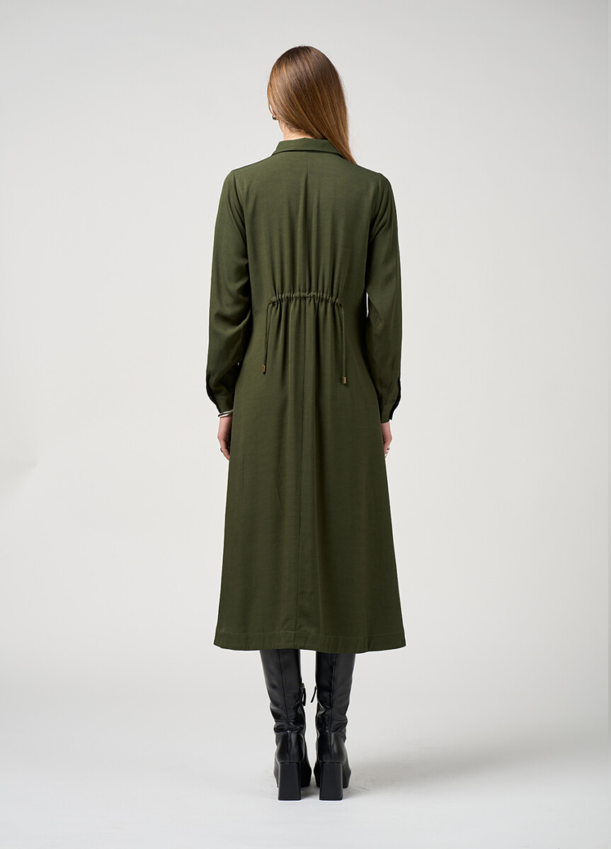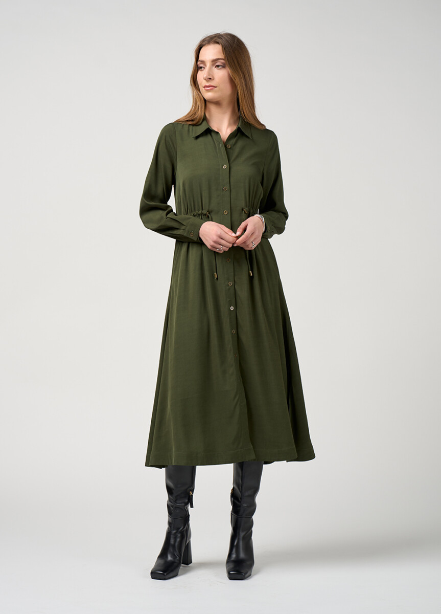 Printed button through midi length shirt dress featuring self ties with delicate metal toggles for versatile fit.