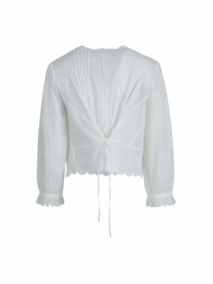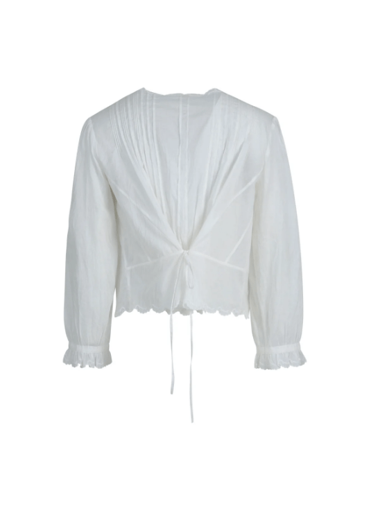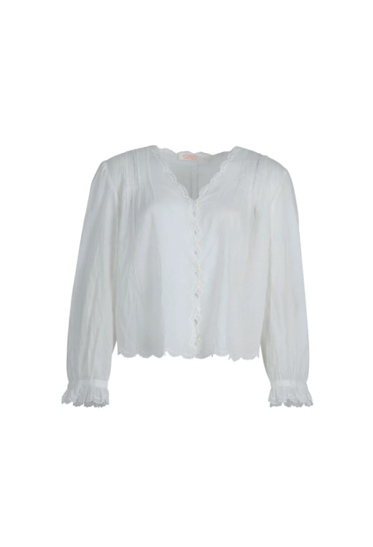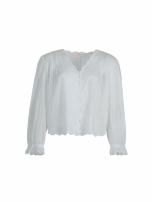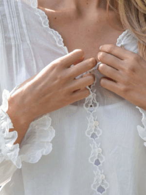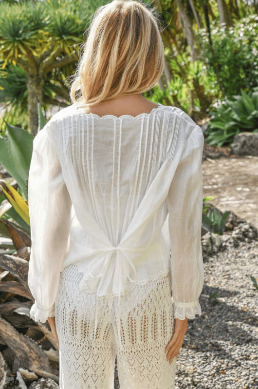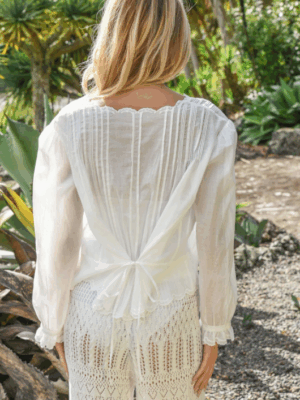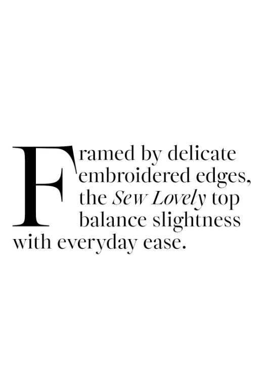 Framed by delicate embroidered edges, the ‘Sew Lovely’ top balances lightness with everyday ease. In semi-sheer ‘Thread Lightly’ cotton voile, it features a button-through front with a flattering V-neckline and a tie-back detail that adds a softly feminine finish.
