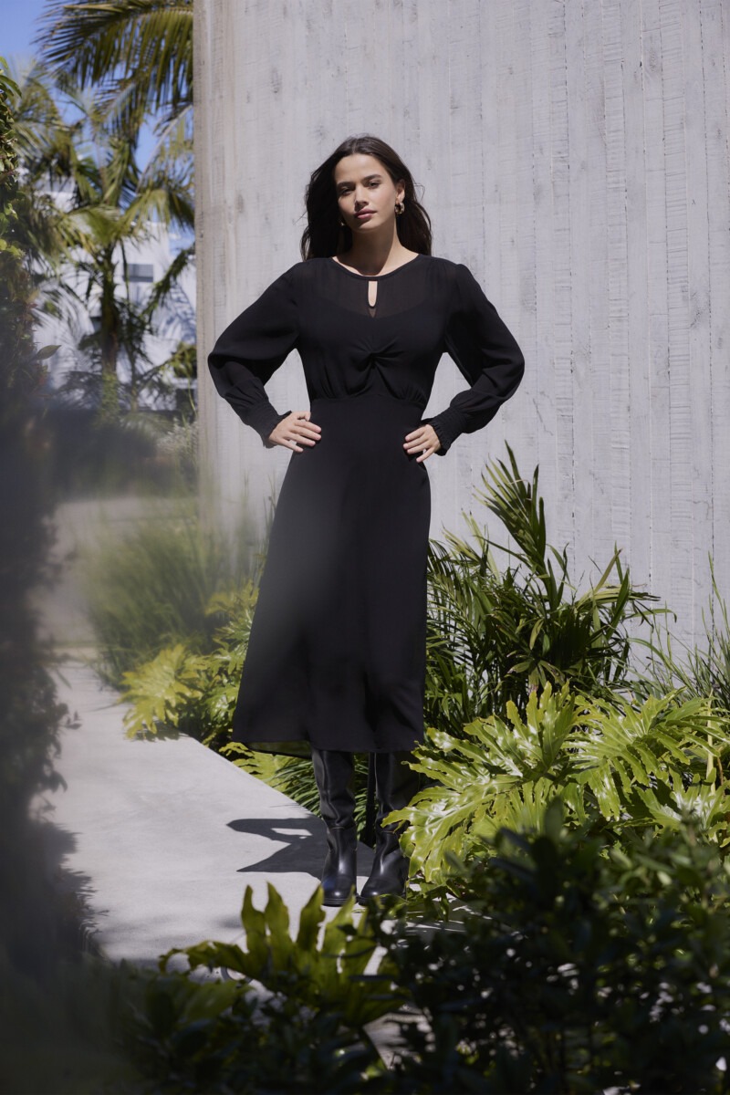 The Shadow Dress is a slimline midi featuring a shaped underbust seam for a flattering fit. A keyhole opening with a front twist adds subtle allure, while softly gathered full-length sleeves with deep shirred cuffs complete the look. A timeless piece that exudes elegance and sophistication.