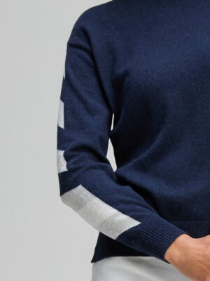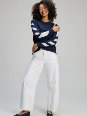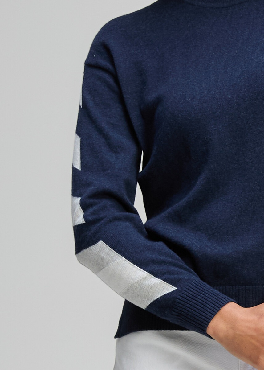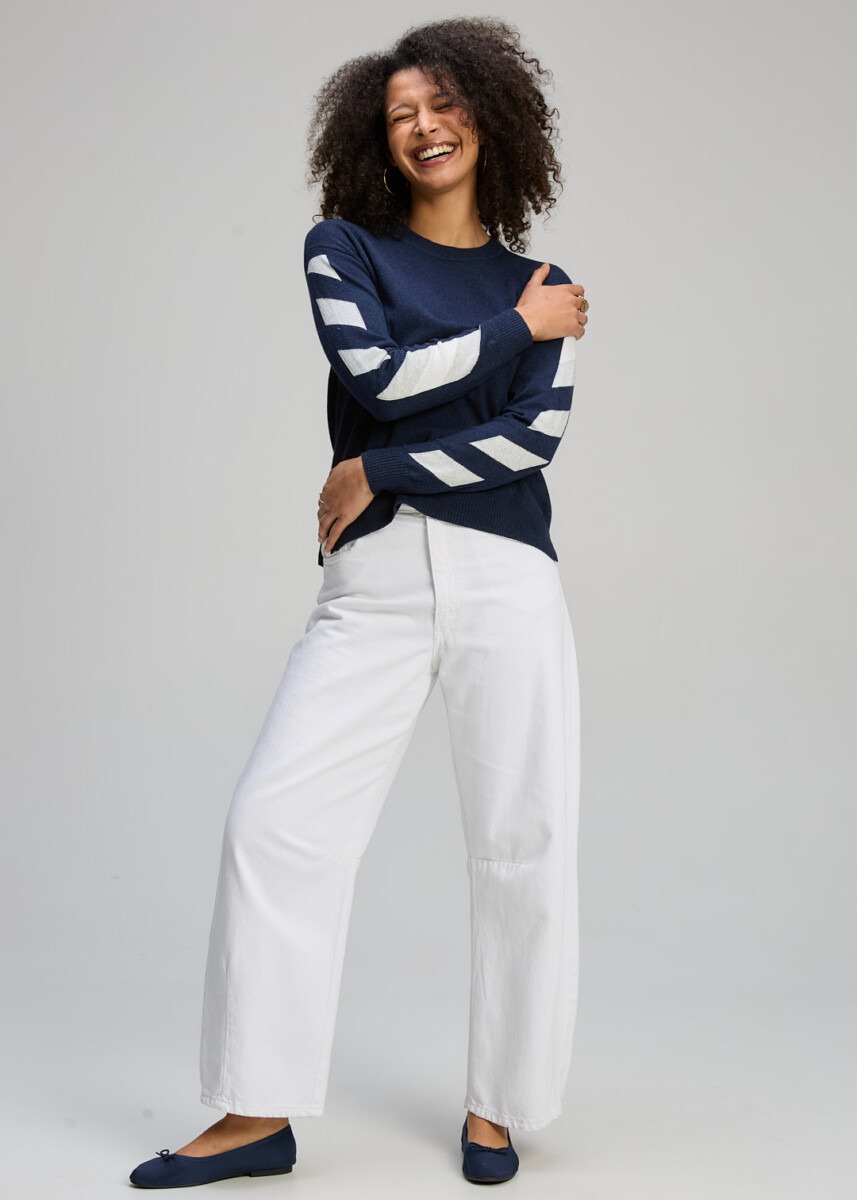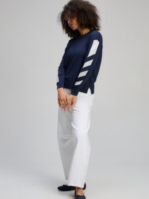 Rendered in a rich dark indigo shade, the design is elevated by clean white accent stripes along the sleeves — adding fresh contrast and contemporary appeal. The silhouette is relaxed yet refined, making it easy to style back with crisp white pants, denim, or tailored separates for a polished off-duty look.