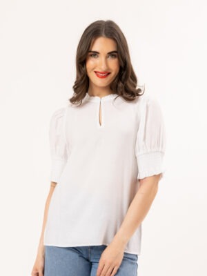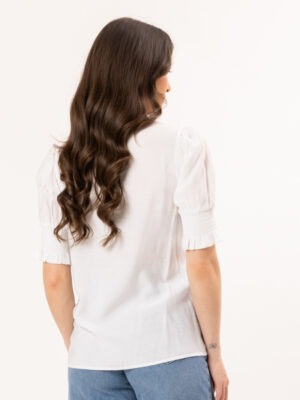 Puff shoulders and elbow-length sleeves with ruffled neckline.